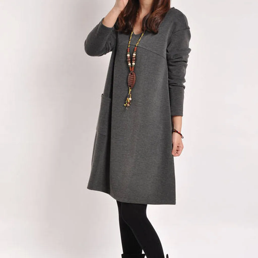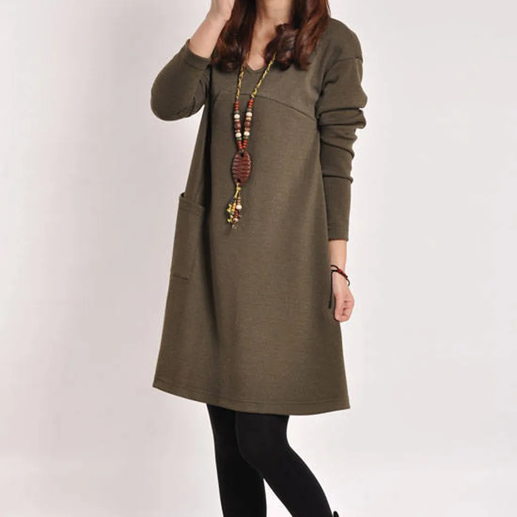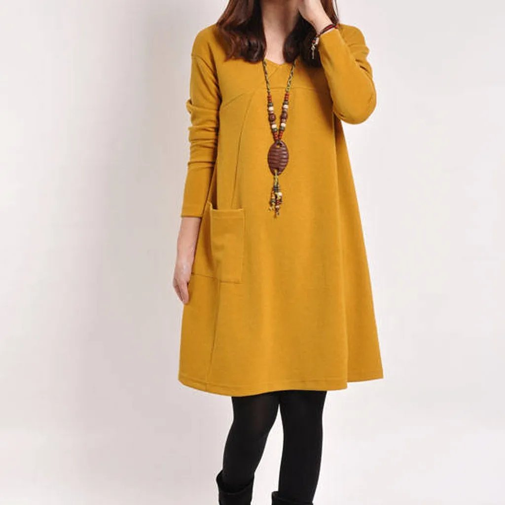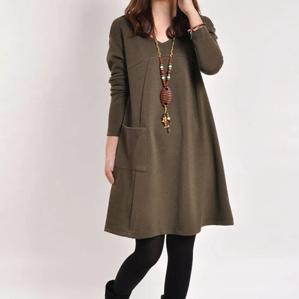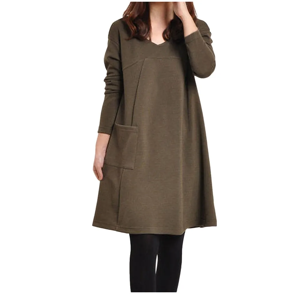 Женское модное повседневное однотонное Свободное платье с v-образным вырезом и карманами, свободное платье с длинным рукавом