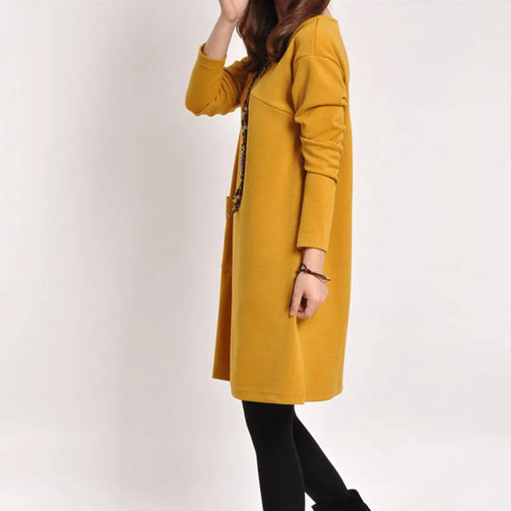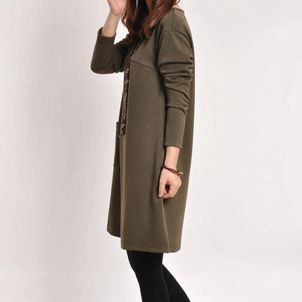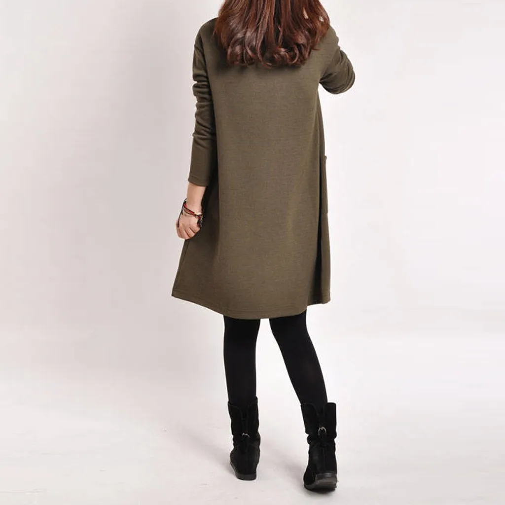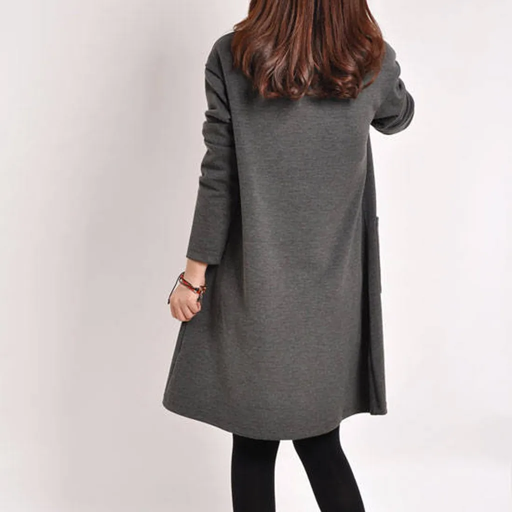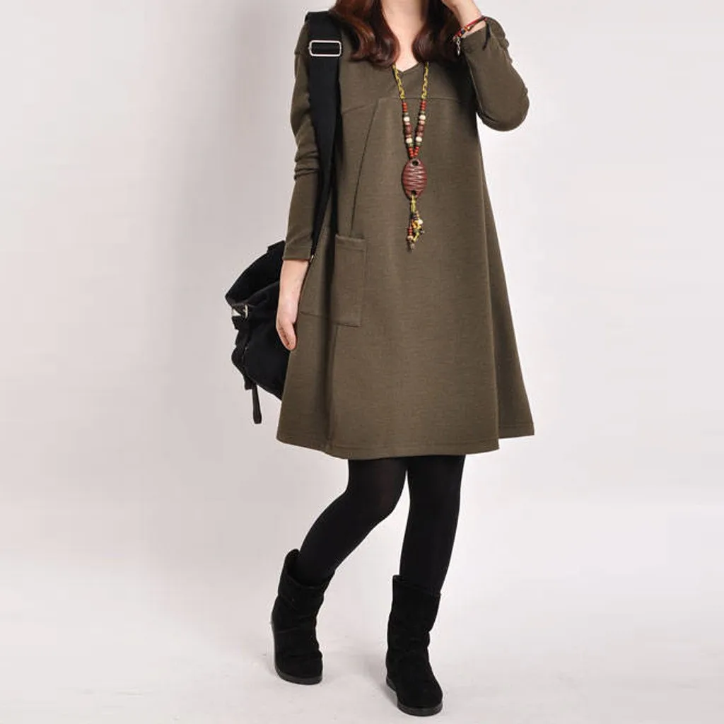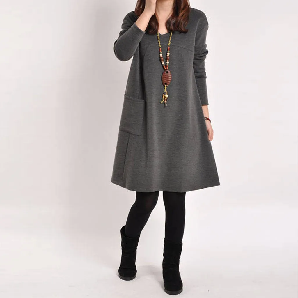 Женское модное повседневное однотонное Свободное платье с v-образным вырезом и карманами, свободное платье с длинным рукавом