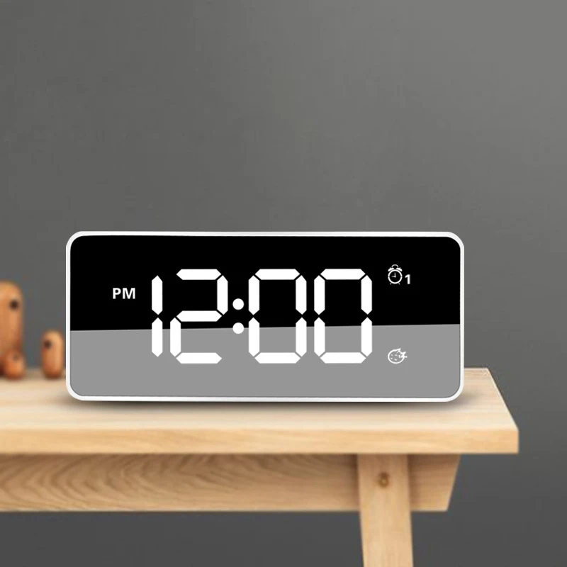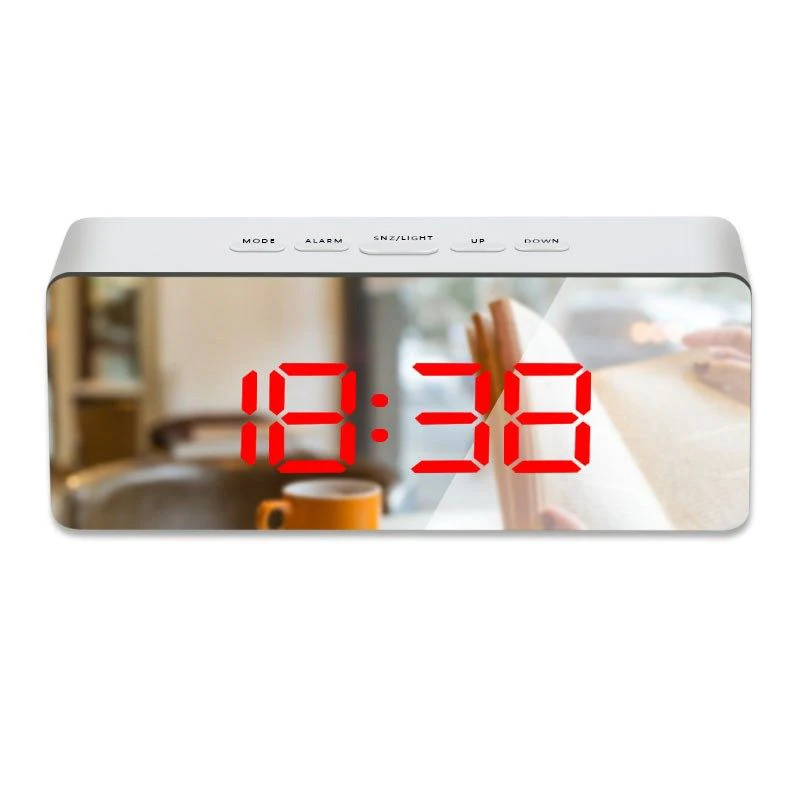 <Многофункциональный> зеркальный дизайн, большой цифровой дисплей, 12/24 часов, будильник, Повтор, температура (°C/°F) дисплей, ночной режим и зеркало, мягкий светильник не будет мешать ночному сну.