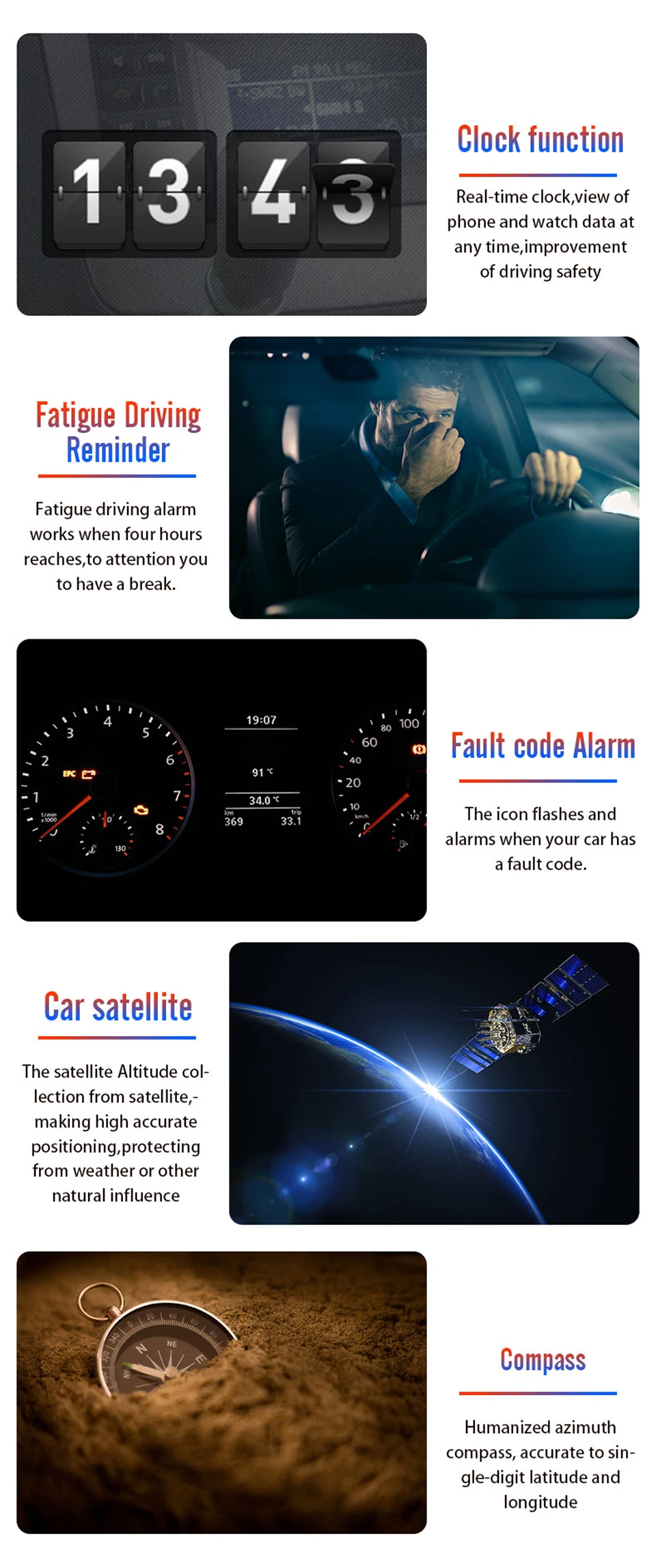 Отображение информации о режиме gps: скорость движения, напряжение батареи, местное время, отображение направления движения, расстояние вождения, время движения, количество милей, переключение высоты, спутниковый сигнал, дисплей