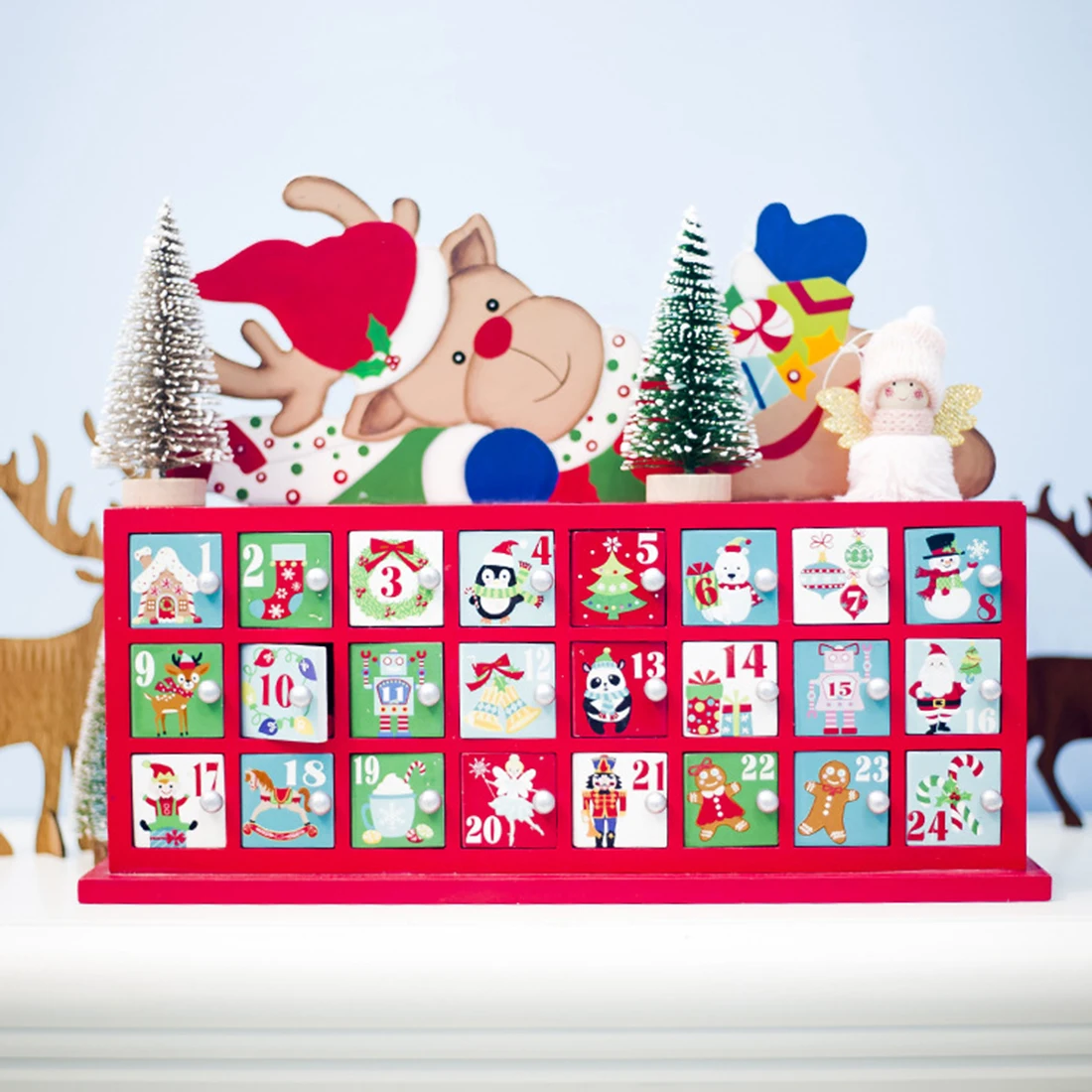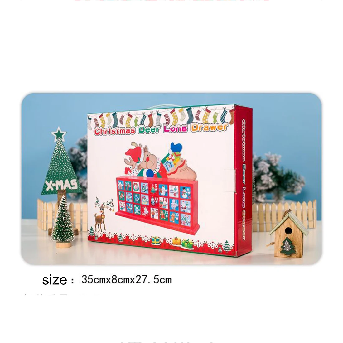 Деревянный Календарь обратного отсчета расписанный Адвент календарь Подарочная коробка для рождественского декора-Лось Особенности: . Изготовлен из предпочтительного древесного материала . Гладкая поверхность без колючек, яркие цвета и не блеклые . Календарь с изображением лося составляет около 33,5 см в длину и 25 см в высоту . Красивая форма, богатые узоры. Маленькое окно шкафа календаря может хранить конфеты . Подходит для хранения конфет или небольших подарков диаметром около 3 см . Подходит для украшения дома на Рождество, подарков и т. Д. Технические характеристики: . Цвет: как показано на рисунке . Материал: дерево . Размеры изделия: 33x25x6,5 см . Вес изделия: 1300 г . Посылка Размеры: 35x27,5x8 см . Вес посылка: 1500 г . Упаковка: картонная коробка Посылка Содержание: . 1 х календарь обратного отсчета
