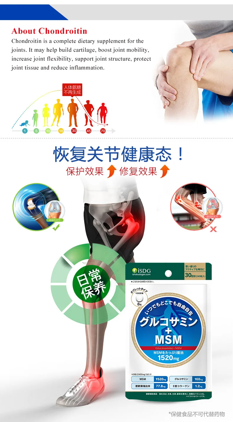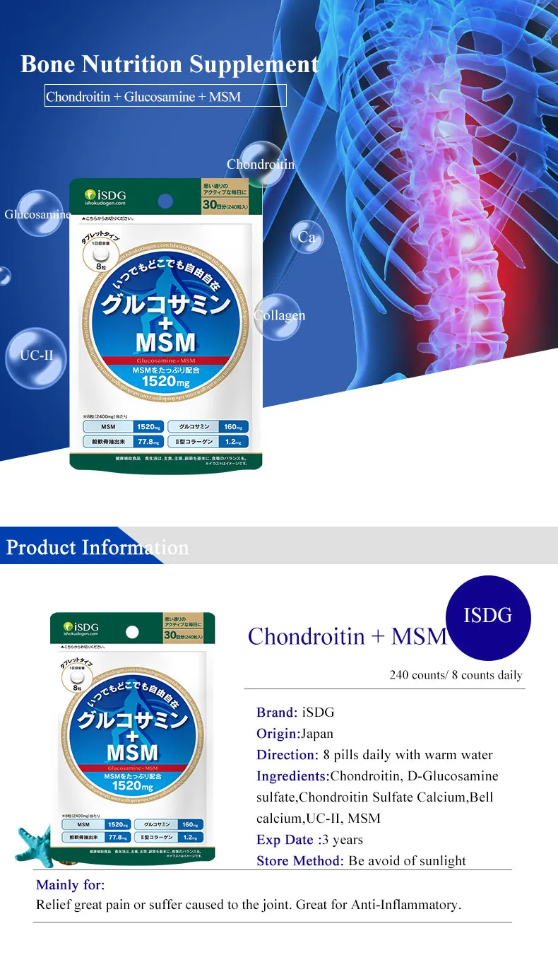 (Производство) Япония (Функции) Добавка для костей облегчает боль в костях и суставах. 【Direction】 8 таблеток в день с теплой водой, за полчаса до сна. 【Capacity】 240 отсчетов (Срок годности) 2022 (Состав) -Хондроитин Стимулирует здоровый хрящ естественным путём и ускоряет восстановление ткани после тренировки. -Глюкозамин Уменьшает суставную нагрузку, связанную с большой физической нагрузкой, улучшает подвижность суставов, также улучшает пищеварение и общее состояние здоровья. -МСМ Улучшает иммунную функцию и разрастание здоровых тканей. -Пептид коллагена Повышает роль аминокислот, способствует метаболизму человека. (Кто может принимать) Взрослые, среднего возраста, пожилые, страдающие артритом, спортсмены. (Противопоказания) Если Вы беременны, кормите грудью или имеете какое-либо заболевание, пожалуйста, проконсультируйтесь с Вашим врачом, до того, как начнёте приём. Пейте больше воды во время курса приёма, так продукт усвоится лучше. Не употребляйте кофе или чай во время приёма продукта. Так как это пищевая добавка, эффект которой нельзя сравнить с медициной, то требуется 1-2 месяца, чтобы наш организм накопил питательные вещества и появился эффект.