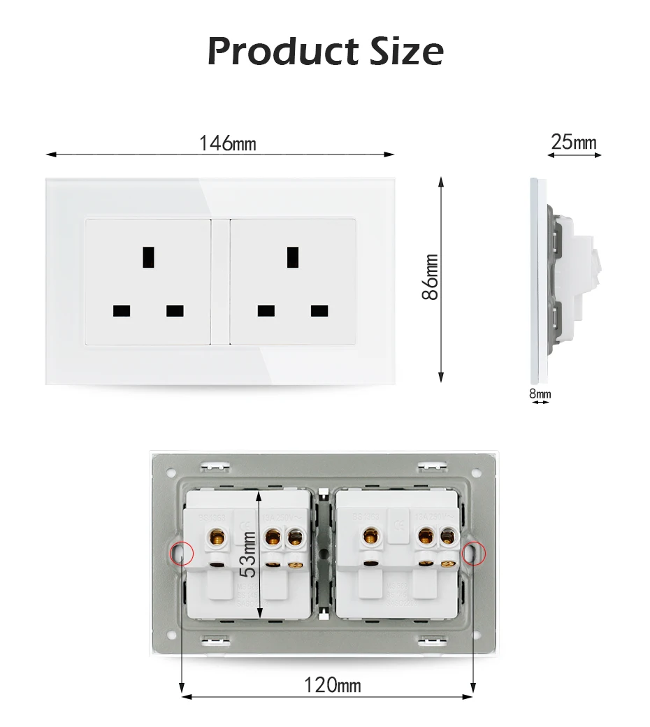 1. Input: 100~240V~50/60Hz,0.4A 2. Rated Voltage(s): 250VAC/50Hz 3. Rated Current: 13A 4. Provision for earthing: With earthing contact 5. Degree of protection against electric shock: With increased protection 6. Type of terminals: Screw-type 7. Dimension: 146mm x 86mm 8. Color: White,Black