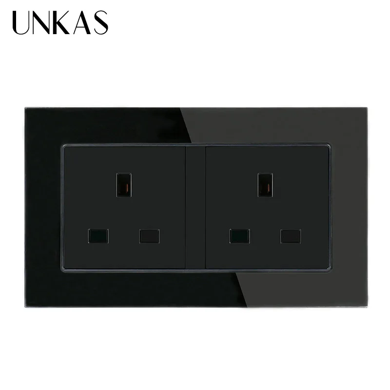 UNKAS Double 146*86mm UK Standard Wall Socket Crystal Glass Panel Power Outlet Grounded AC 100~250V,Siamesed Design