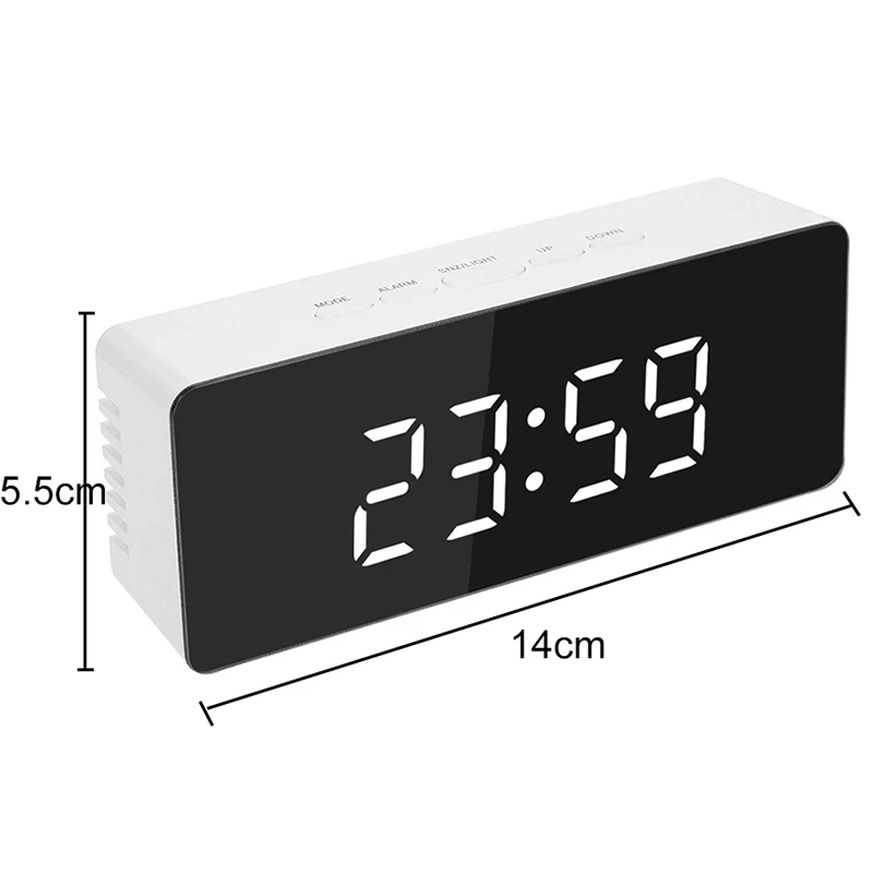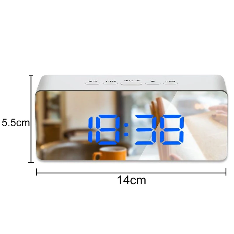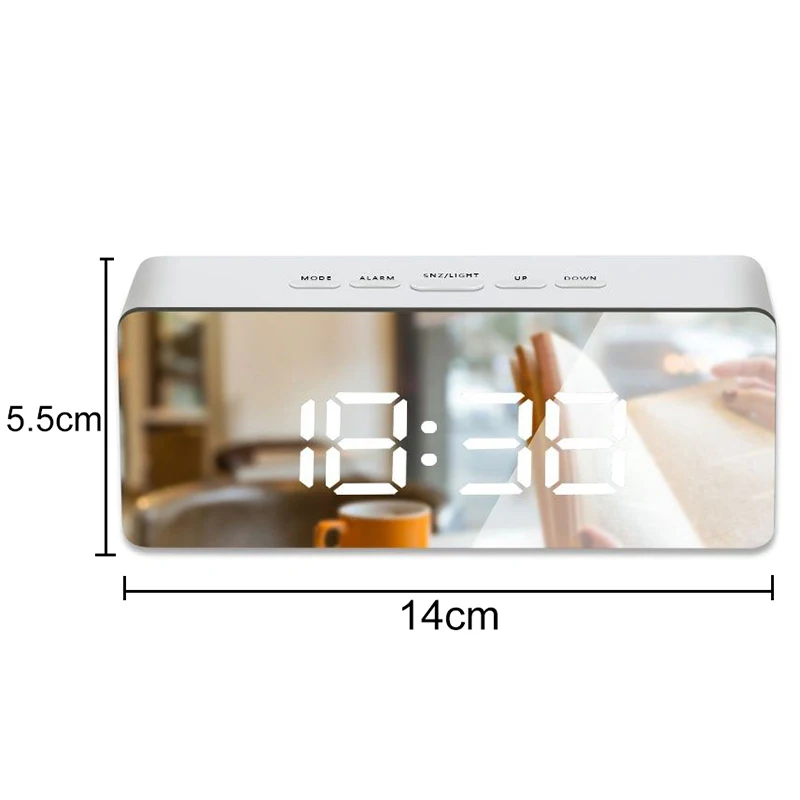 <Многофункциональный> дизайн зеркального стиля, большой цифровой дисплей, 12/24 часов, будильник, Повтор, отображение температуры (°C/°F), ночной режим и зеркало, мягкий светильник не будет мешать ночному сну.
