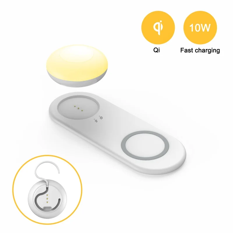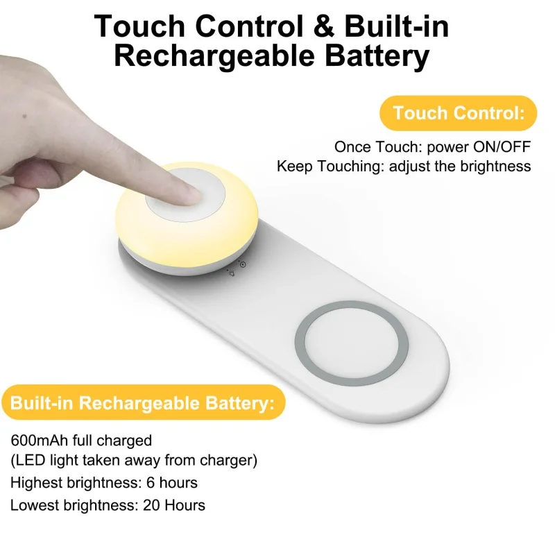 Беспроводная зарядная станция с светодиодный Ночной светильник, который съемный и Перезаряжаемый, будет идеальным выбором для вашей кровати. Вы можете взять светодиодный ночной Светильник для кухни, детские комнаты, гардероб, и т. д., как он может адсорбироваться и повешен.
