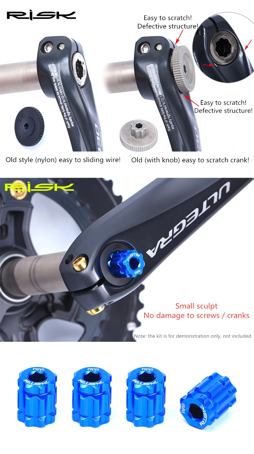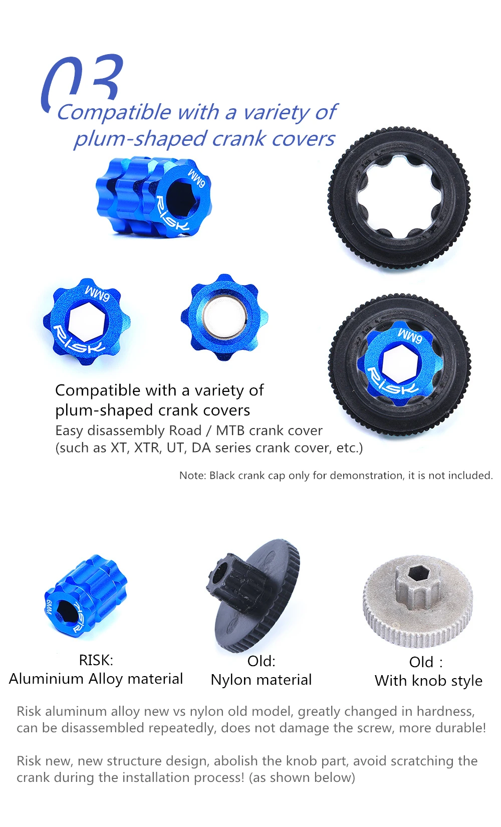 Совместим с различными плавающими кривошипами Легкая разборка чехол для дороги/рукоятка MTB (Например, крышка шатуна серии XT, XTR, UT, DA и т. д.) Примечание: черная кривошипная крышка только для демонстрации, она не входит в комплект. Риски: материал из алюминиевого сплава Старая: нейлоновый материал Старая: с ручкой Новый алюминиевый сплав против старой модели нейлона, значительно изменен по твердости, может быть демонтирован многократно, не повреждает винт, более прочный! Новый рискованный дизайн, конструкция новой конструкции, часть ручки, избегайте царапин на кривошипе во время процесса установки! (как показано ниже)