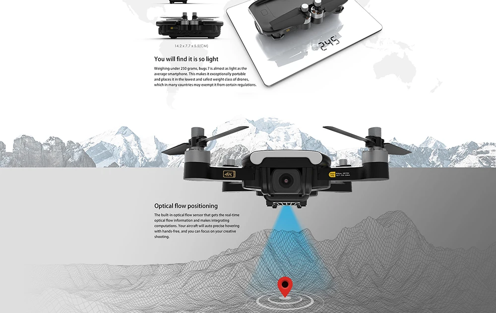 1) сложить тело для удобной переноски. 2) Интеллектуальное позиционирование. Система позиционирования модуля GPS с оптическим модулем обеспечивает хорошие летные характеристики как в помещении, так и на открытом воздухе. 3) Режим новичка: для новичка, встроенного в геозону, вы можете летать на большой высоте, чтобы новички могли использовать его с уверенностью! 4) Интеллектуальное управление: взлет с одной клавишей, посадка с одной клавишей, возврат с одной клавиши и другие функции делают полет более не сложным. 5) Безопасный полет: маломощный возврат, потерянный и обратный полет, неконтролируемый возврат и другие безопасные режимы защиты полета для обеспечения безопасности полета; 6) Несколько режимов полета: фиксированная высота, фиксированная точка, отслеживание, окружение, наведение, траектория и другие интеллектуальные режимы полета, которые могут удовлетворить потребности различных сценариев. 7) 4K HD камера: вы можете делать HD фото или видео. Снимайте видео в полете, чтобы получить необычные работы с разными перспективами и композициями. 8) Бесщеточный мотор: низкий уровень шума и сильное сопротивление ветра. 9) Встроенный датчик позиционирования: (GPS / визуальное позиционирование / барометр) 10) Левая и правая руки могут переключать пульт дистанционного управления: подходит для разных людей, использующих левую и правую руки. Функции: вверх / вниз, вперед / назад, влево / вправо, боковой полет, удержание высоты, GPS, 5G Wifi FPV, взлет / посадка / возврат одним нажатием, оптическое позиционирование потока, ультразвуковое, слежение за мной Точка полета, режим орбиты, траектория полет, потеря контроля / возврата сигнала, электронный забор, 4K камера, 300M дистанция управления. Технические характеристики: Название продукта: GPS мини-дрон MJX B7 Мотор: 1306 2750кВ безщеточный Диапазон частот: 2,4 Г Взлетная масса беспилотника: 245 грамм Аккумулятор Drone: 7,6 В 1500 мАч литиевая батарея Максимальное время полета: 15 минут Размер дрона: (расширенный) 24 * 23,5 * 5,5 см, (В сложенном виде) 14 * 7 * 5,5 см Камера: 5G WIFI FPV 4K 120 ° широкоугольная HD-камера. Его можно отрегулировать вручную на 90 °. FPV: 200-300 метров. 720P. Частота кадров: 25 кадров в секунду Локальное хранилище видео: Разрешение: 3840 * 2160. Контрольное расстояние и дальность передачи изображения: 200-300 метров. Максимальная скорость полета: 25 км / ч Время зарядки: 150 минут (зарядное устройство может заряжать две батареи одновременно) SD-карта может быть загружена для расширения памяти до 32 ГБ. В комплект поставки входят: 1 х дрон 1 пульт дистанционного управления 4 винта 1 х USB-кабель 1 х Английский Руководство 1 зарядное устройство 1 отвертка 1 х руководство