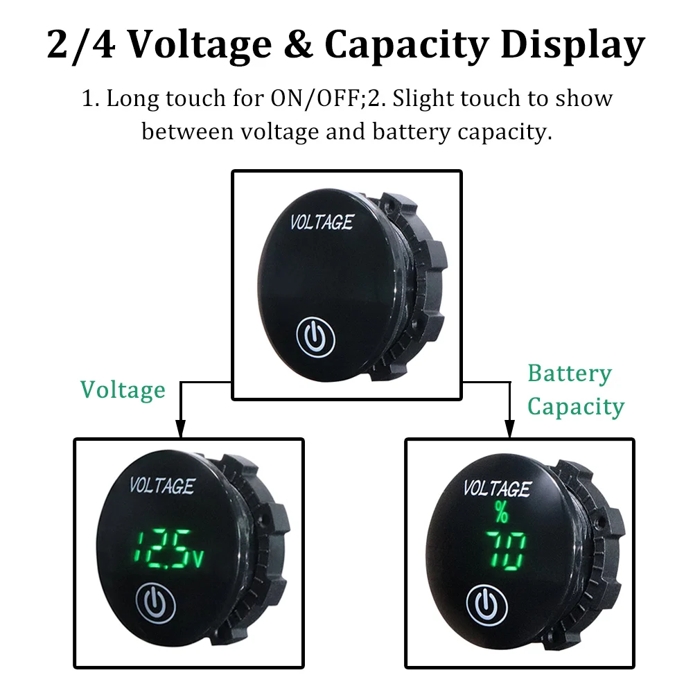 3. Поддержка Напряжение и Батарея Ёмкость монитора. Небольшая прикоснитесь к круглый светодиодный Дисплей для того, чтобы показать между автомобиля Напряжение и Батарея Ёмкость.