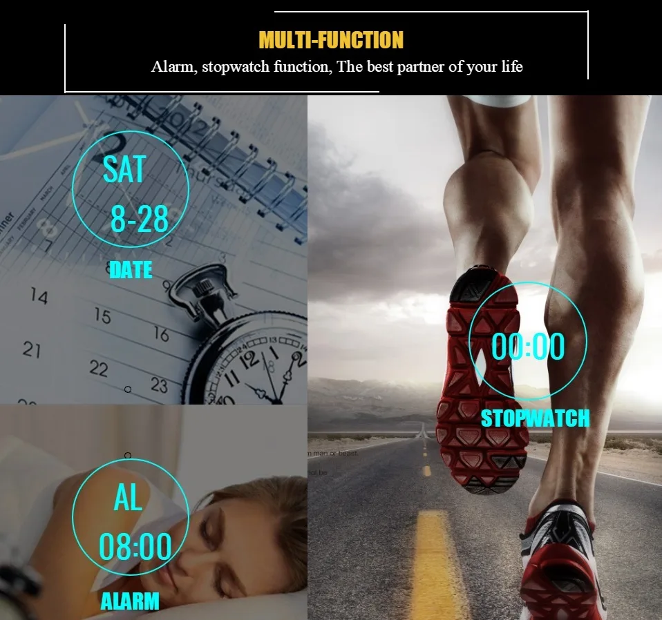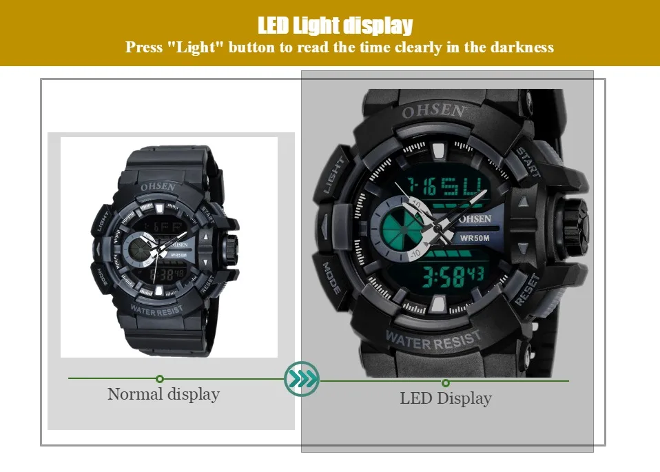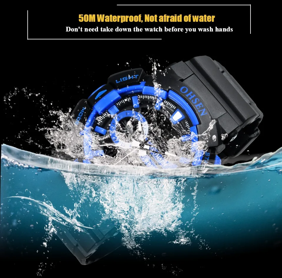 С двумя часовыми поясами Дисплей Цифровой: часы, минуты, секунды, вечера, месяц, дата, день 12/24 формата отображения времени Цифровой светодиодный дисплей, нажмите кнопку «светильник», чтобы четко видеть время в темноте Сигнализация и функция почасового звонка Специальная конструкция с хронограф (секундомер) при температуре не выше 0,01 второй шаг На водонепроницаемость на глубине до 50 м (не нажимайте кнопки в воде) Ударопрочная, подходит как для занятий спортом на открытом воздухе, так и для занятий в помещении