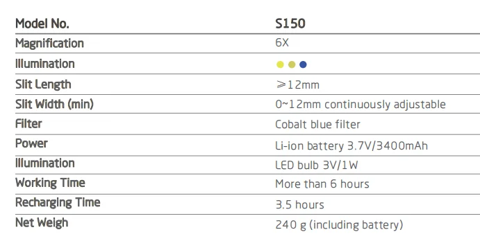 1. Ультра-портативный: ультра-портативный является отличным диагностическим инструментом для исследования передней части сегментных структур и глазных аномалий. Его легкая в эксплуатации оптическая система обеспечивает высокую яркость, постоянно регулируемое щелевое изображение идеально подходит для предиатрической и гериатрической установки, аварийных отделов показов, ходовых округов, помимо выдвижения, послеоперационные оценки и работа в Миссии; 2. Светодиодный светильник: первая и единственная портативная щелевая лампа в мире, применяющая светодиодный осветительный прибор. Наиболее заметное преимущество нашей системы светодиодного освещения дает испытателю четкое изображение без бликов; 3. Комфортное использование: низкий уровень теплового излучения от нашей светодиодный лампы делает наиболее комфортным исследование опыта для пациента; 4. Самый острый разрез: с системой визуализации лезвия S150 дает такой же острый разрез, как лучшая Классическая щелевая лампа в мире; 5. Нет необходимости заменять осветительную лампу: светодиодный светильник, используемый в переносном щелевом лампе S150, рассчитан на 20 000 часов при полной мощности. Срок его службы почти в 10 раз дольше, чем обычная галогенная лампа; 6. Энергосбережение: S150 может работать в течение долгих часов без замены батарей.