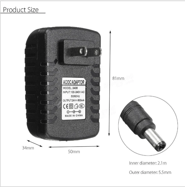 Импульсный источник питания LED Вход 100-240Vac Выход 24 В постоянного тока Ток 1А Мощность 24 Вт Порт постоянного тока 5,5*2,5 (также подходит для 5,5*2,1 мм) Шнур питания длиной 1 метр