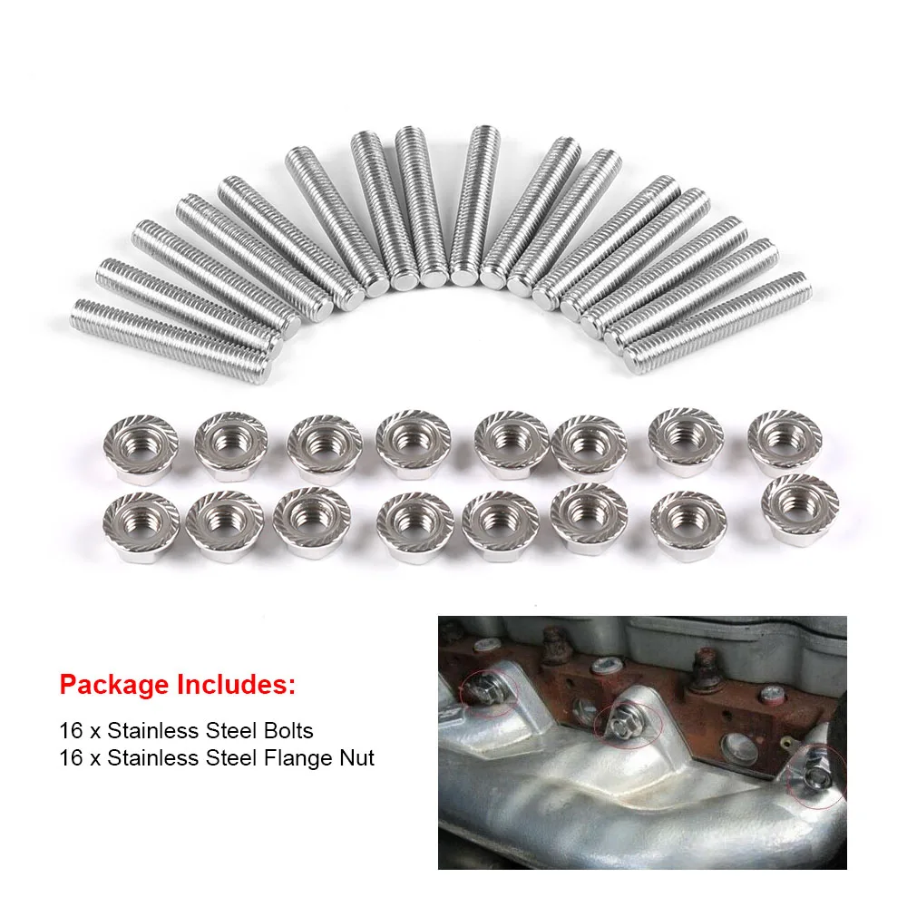 This is a set of sixteen stainless steel studs (with an allen drive for easy installation) and stainless steel serrated face flange nuts. They will replace the factory hardware that rust and break on Ford 4.6liter and 5.4liter engines. Can be used on applications ranging from our F250 to a 9 second, turbocharged For Mustang Cobra