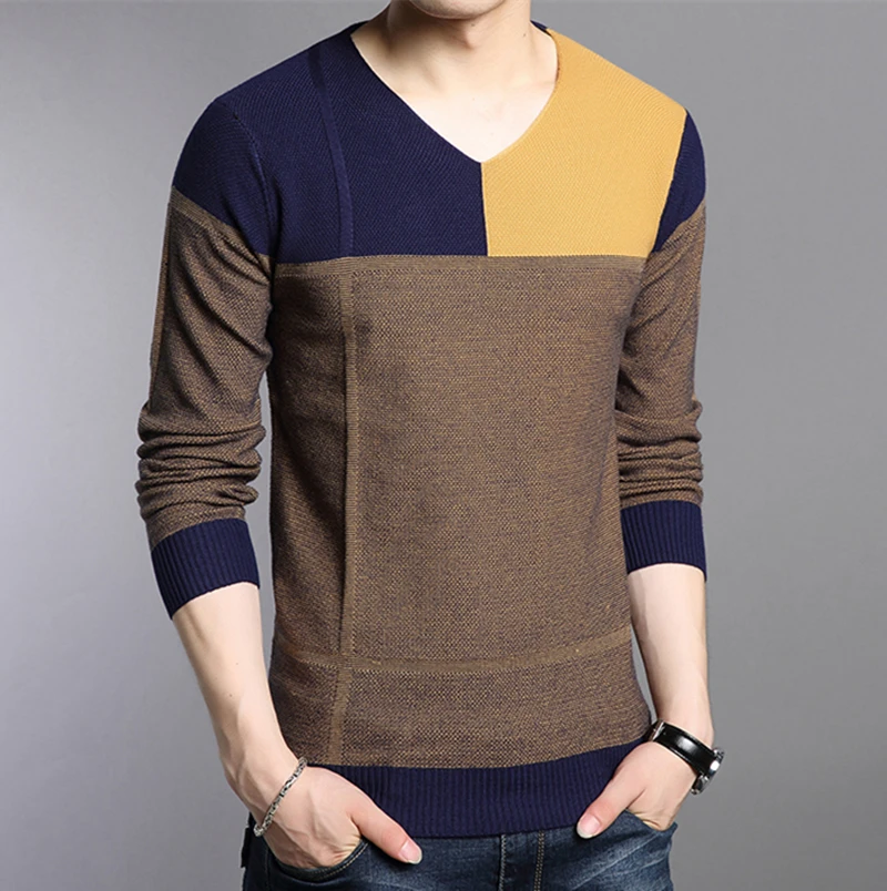 Новинка 2019, мужской пуловер в стиле пэтчворк, мужской свитер, мужские свитера, облегающая Вязанная одежда, модная одежда цвета хаки, зеленый, красный, мужской свитер J759
