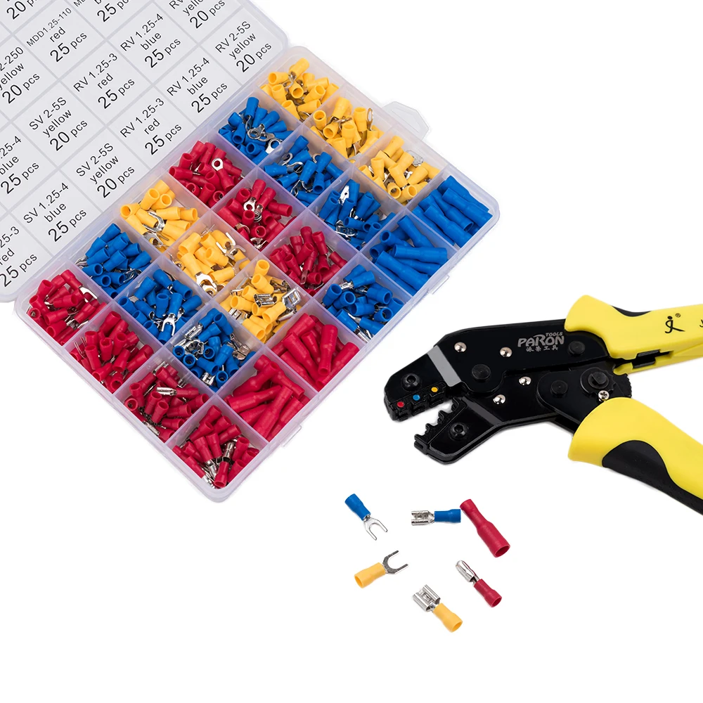 Полный обжимной инструмент комплект --- полный оснащен обжимной инструмент и 500 Изолированные Наконечники провода открытые баррель разъем от 14 до 22 AWG (0,5-2.5mm2) для поддержки малого DIY проектов и большой электрические ремонт. С регулировочным винтом вы можете регулировать прочность обжима.