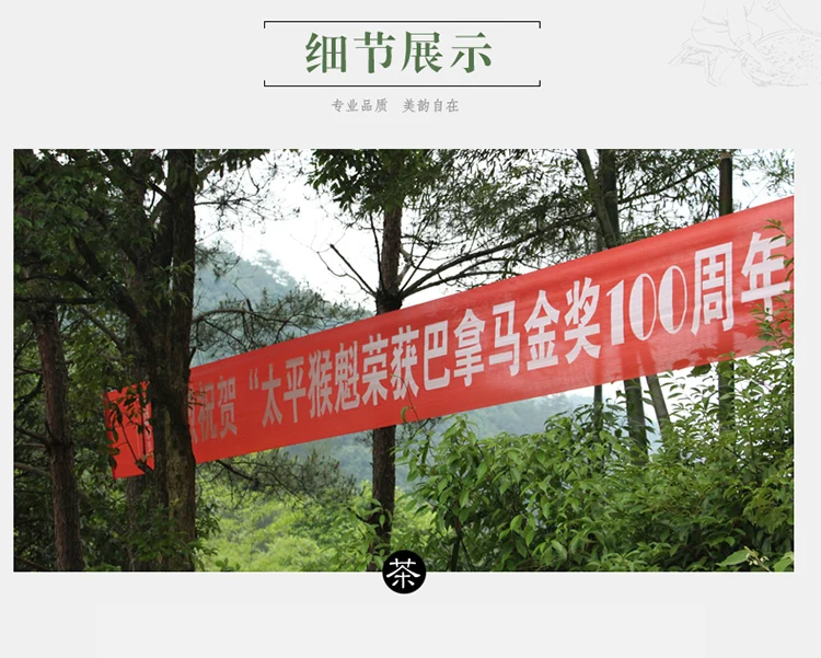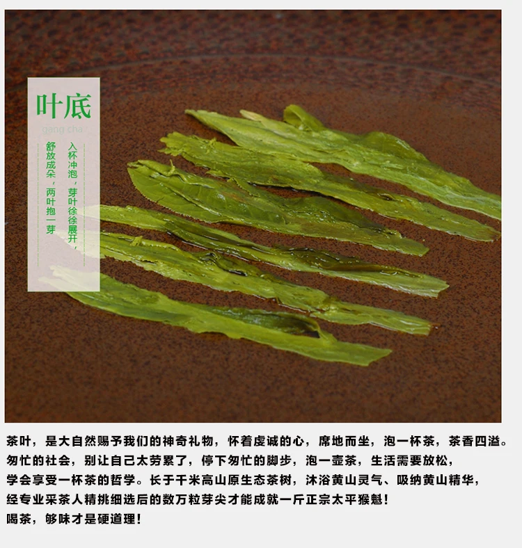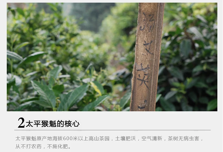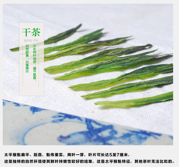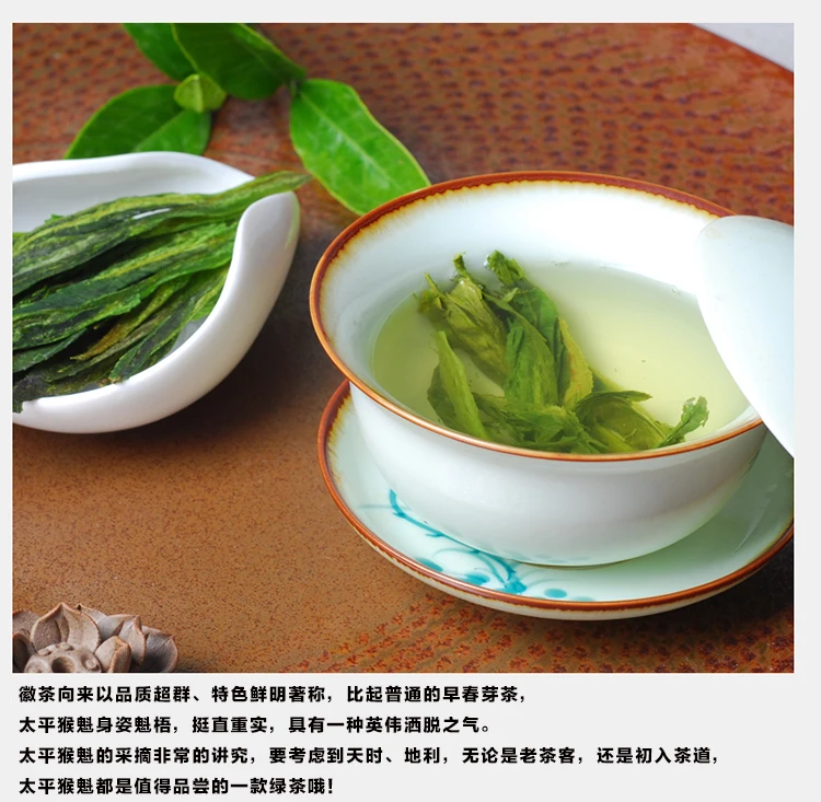 Чай тайпинг обезьянки Куи прямой, плоский и ровный, густой и сильный, с белыми волосами, пышными и невидимыми, но не открытыми, с бледно-зеленым цветом, основной Веной листьев является цвет свиньи, как и оливы; заваренный в чашке, почки и листья медленно распределяются, Расслабленный в бутоне, два листа держат бутон, или повесить или утонуть; Чайный суп зеленый, ароматный и освежающий.