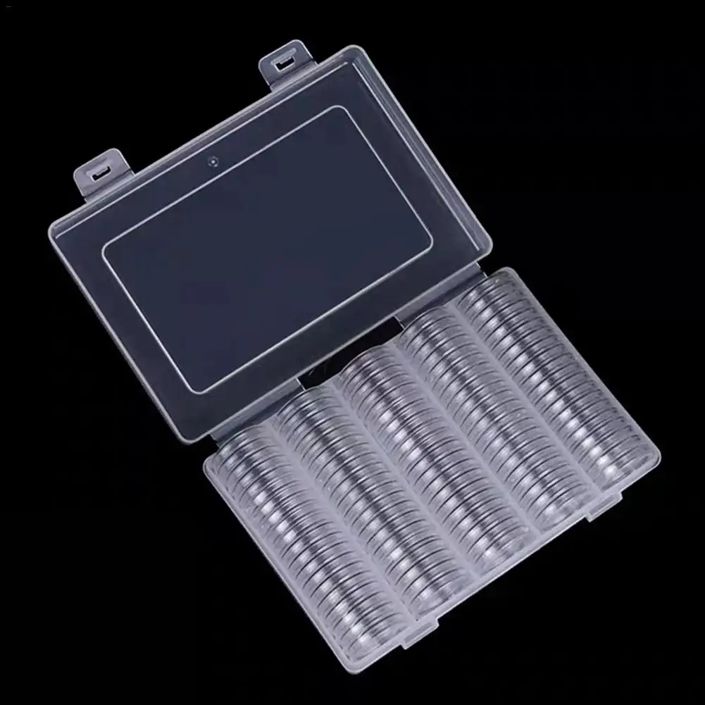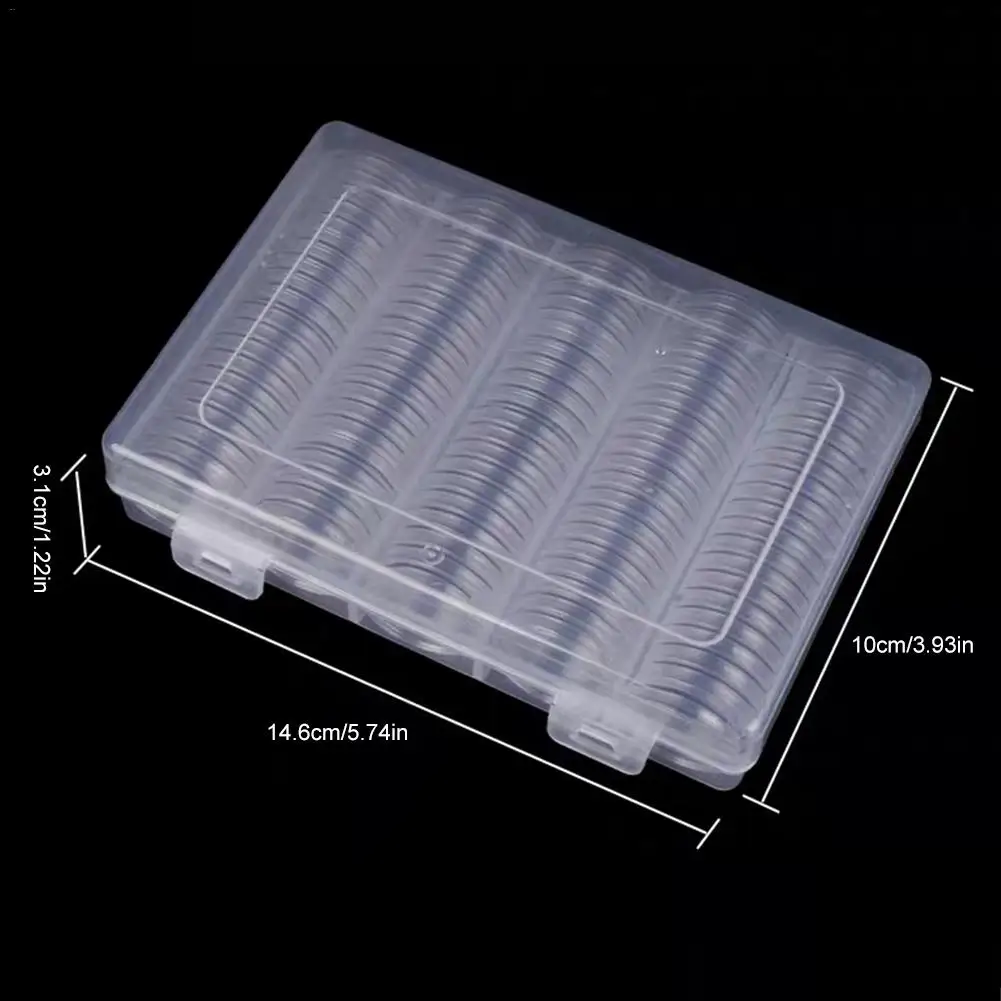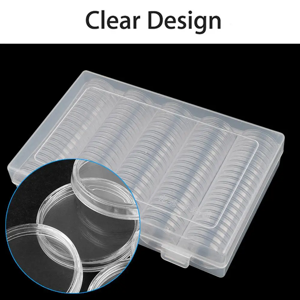 5. Список: одна посылка включает в себя 100 круглых прозрачных пластиковых капсулы для монет и 1 прозрачный пластиковый контейнер для хранения.