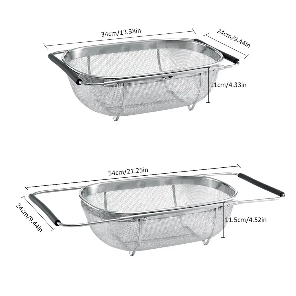 1. Материал: высококачественная нержавеющая сталь + силикон. 2. Вы можете мыть фрукты и овощи с продуктом, который также может быть использован в качестве фильтрующей сетки, дуршлаг, слив, хранилище и корзина для фруктов. 3. Выдвижная ручка отличается большой практичностью и удобством в эксплуатации, подходит для различных размеров стиральной раковины. 4. Он изготовлен из нержавеющей стали, которая является прочной, стабильной, трудно ржаветь или носить. Наш продукт, который вы покупаете, используется для длительного времени, поэтому он может помочь вам сэкономить больше денег. Размеры: около: 34*24*11 см/13,39*9,45*4,33 в, Размер в разложенном виде: около 54*24*11,5 см/21,26*9,45*4,53 дюймов Комплектация:1 x подставка для сушки
