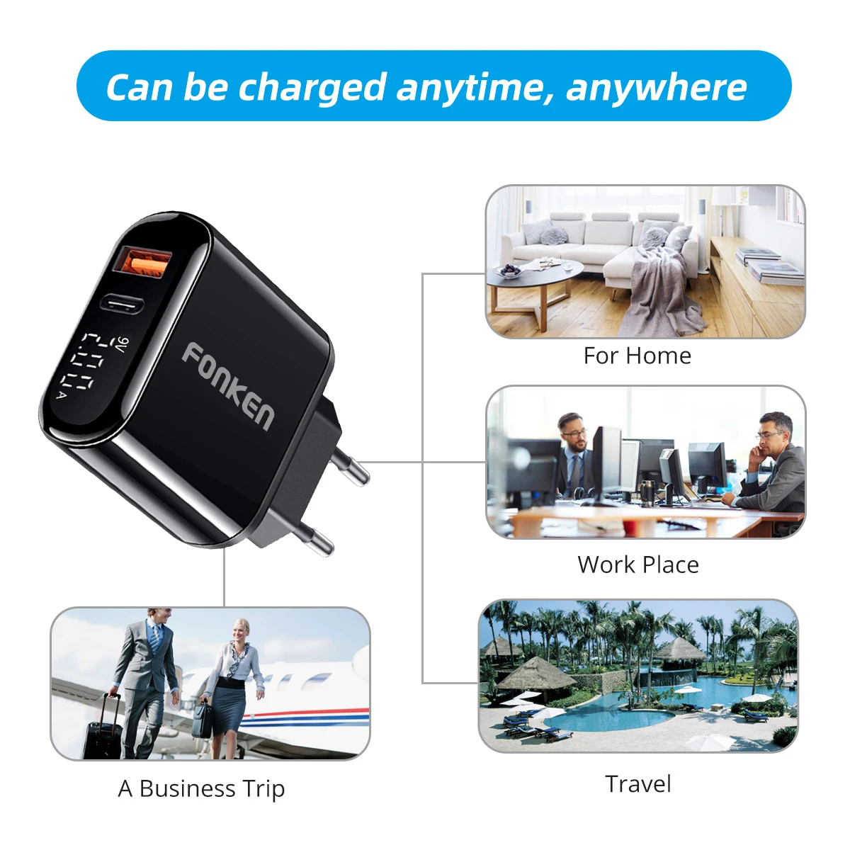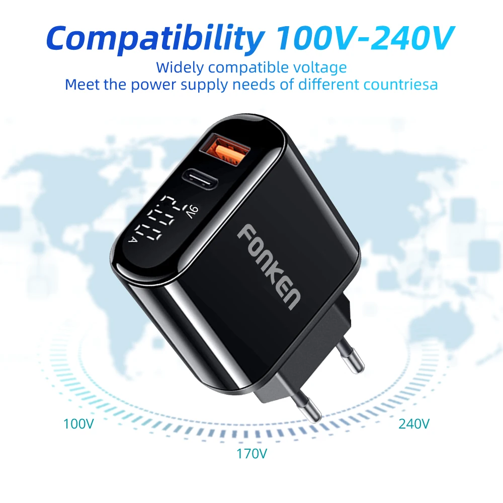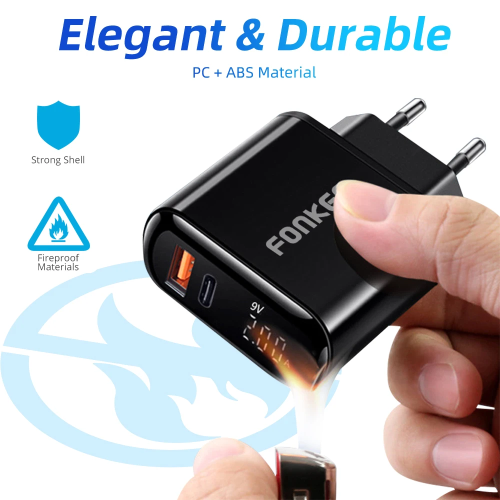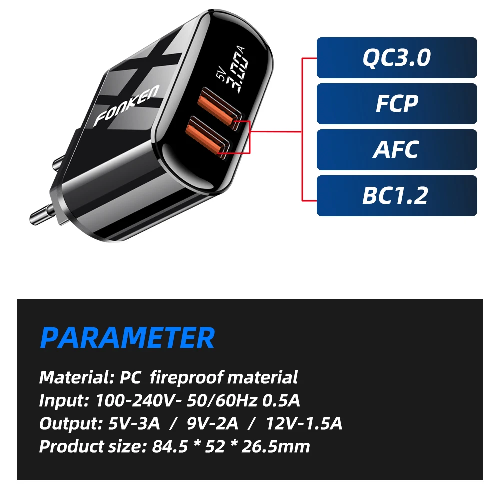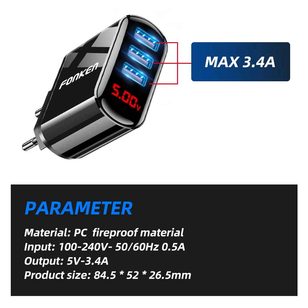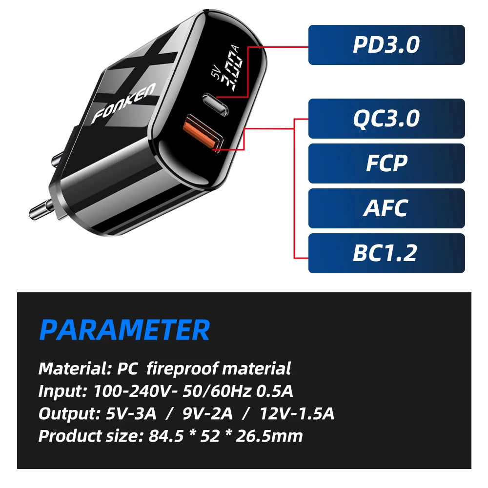 -Светодиодный дисплей, напряжение зарядки, отображение тока. -Порт зарядки USB C PD, выход до 18 Вт -Макс 3,4 A 3 usb порта -Используется для смартфонов, планшетных ПК, power bank, для устройств ios -Портативное зарядное устройство для дома, офиса, путешествий и других помещений. -Умный соответствующий ток. Встроенный интеллектуальный чип, в соответствии с различными устройствами, соответствующий требуемому выходу, быстрая зарядка и не повреждает аккумулятор. -Безопасный Чехол для ПК, не горячий при зарядке. -Ультра-широкое напряжение, штепсельная вилка европейского стандарта, подходит для различных национальных стандартов.
