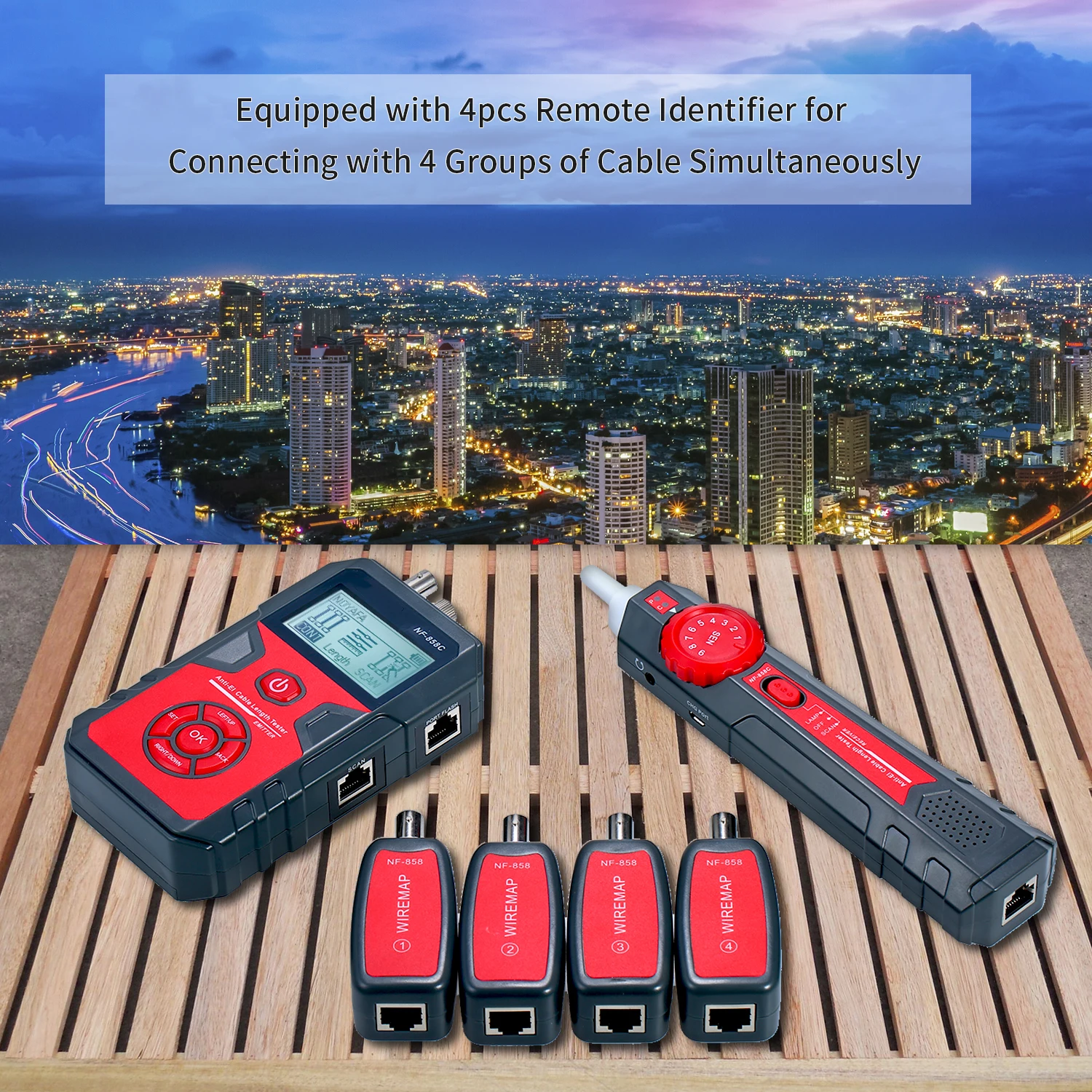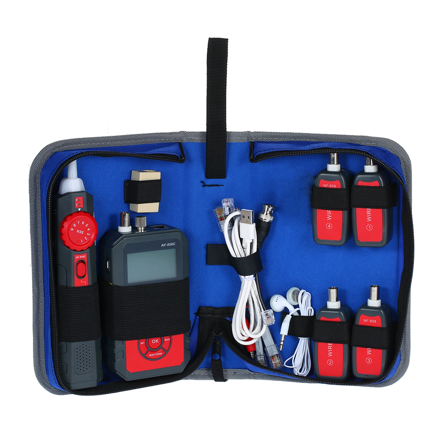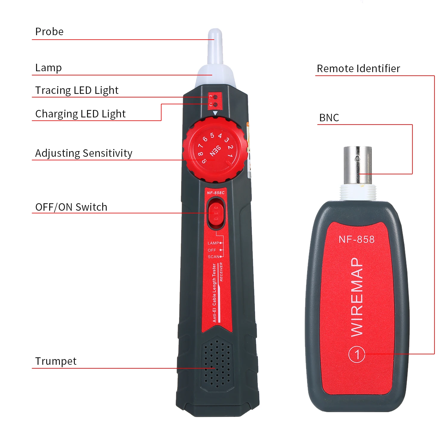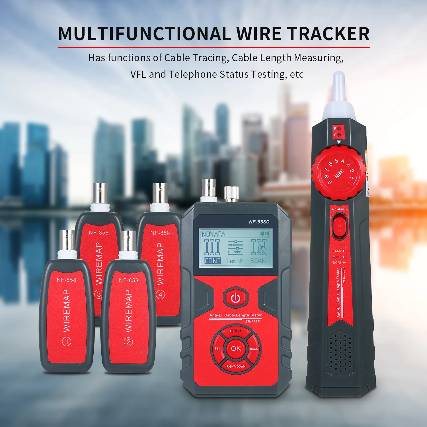 Этот тестер является многофункциональным проводным трекером, включая кабельный излучатель, приемник и четыре удаленных устройства. Он имеет такие функции, как отслеживание телефонного провода, отслеживание сетевого провода, отслеживание кабеля питания, проверка сетевого провода и т. д. и производит быстрые и точные измерения. Это необходимый инструмент для тестирования телекоммуникационной инженерии, электропроводки и обслуживания сети.