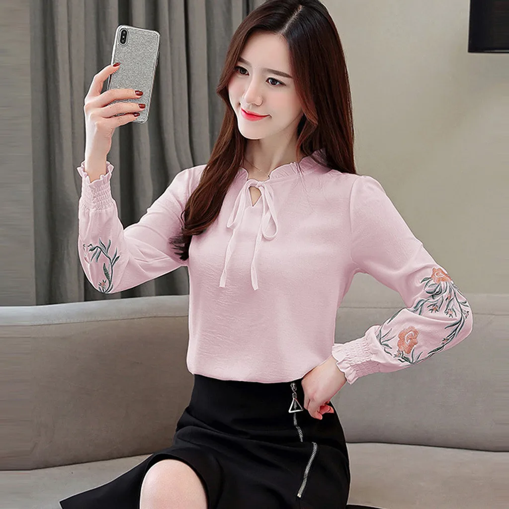 Женская шифоновая рубашка с длинным рукавом, V-образным вырезом и вышивкой