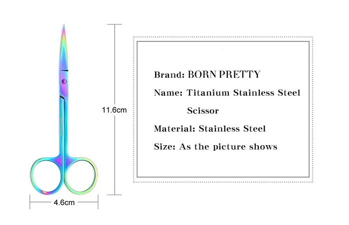 Спецификация: Количество: 1 шт. Материал: нержавеющая сталь Цвет: цвет насыщенный Размер: как показано на картинке Посылка: 1 шт. BORN PRETTY colory High Precision Staight Head титановые ножницы из нержавеющей стали Характеристика: 100% новый и высокое качество Нержавеющая сталь, прочная, красивая, долговечная. Уникальный дизайн, острый, но не повреждает ногти, быстрое удаление лака для ногтей. Противоскользящая ручка, не легко упасть. Подходит для профессионального использования в салонах или домашнего использования Полезный педикюр, средство для ухода. 2. Нанесите салфетки для ногтей около 7-10 минут. 3. Применить BORN PRETTYAurorasСредство для удаления лишнего геля. 4. Все удалены. 5. Нанесите красивое Масло для кутикулы и мягко массируйте. Деликатные советы: 1. Избегайте контакта с кожей. Если возникают покраснения или другие признаки нежелательной реакции, немедленно прекратите использование. 2. Плотно закрываются. Держите подальше от солнечного света. Хранить в недоступном для детей месте.