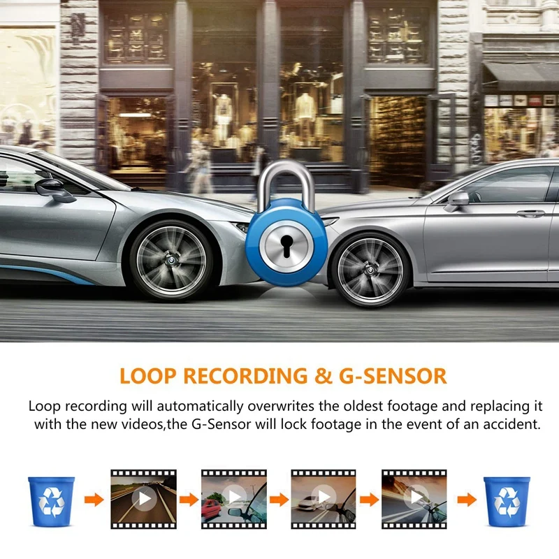 [Бесшовная циклическая запись и g-сенсор] бесшовная циклическая запись перезаписывает самые старые кадры с новейшим заполнением карты до емкости. С переменной чувствительностью g-сенсор автоматически обнаруживает внезапное встряхивание/столкновение и аварийный блокирует отснятый материал на «файл события», чтобы предотвратить перезапись видео.