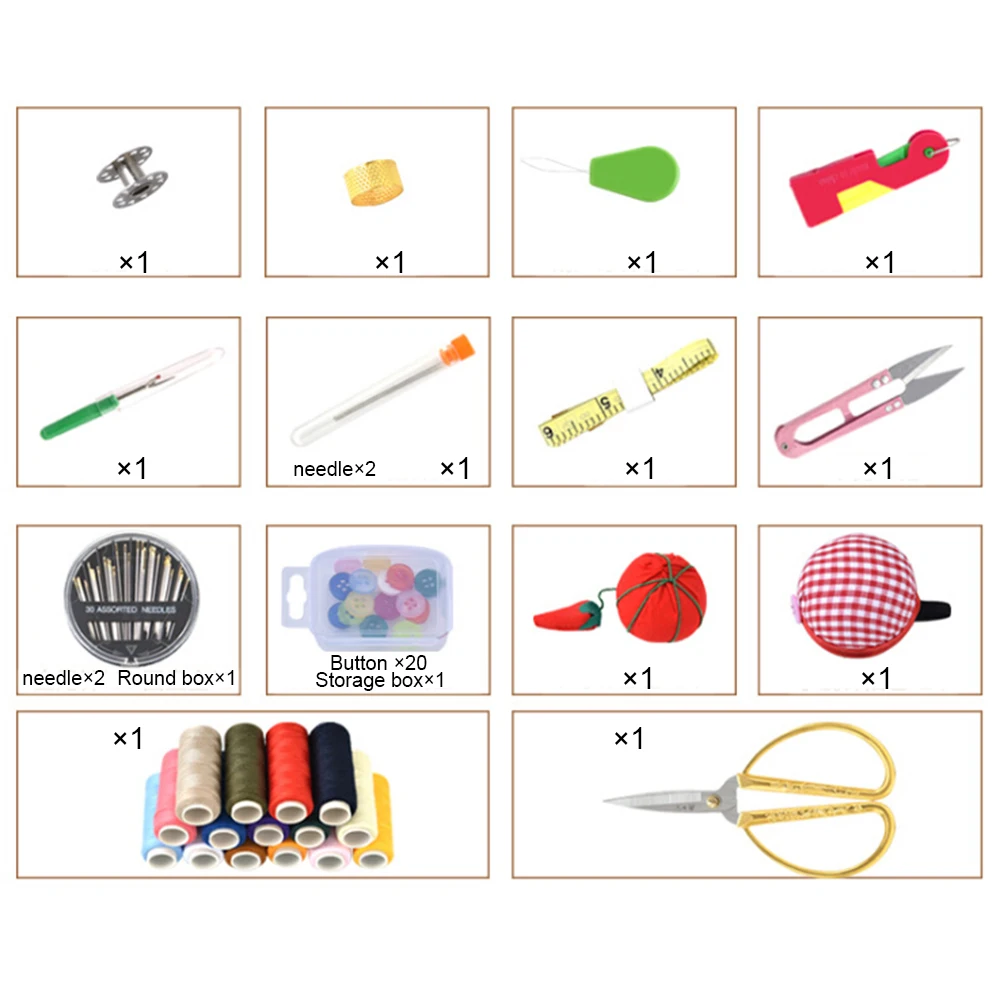 -Содержит необходимые вам, 15 полиэстер катушки ниток для шитья в самых популярных цветах, 13 швейных инструментов и один ящик для хранения.