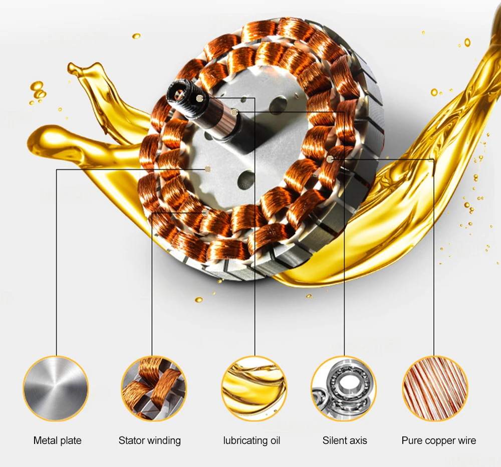 1. Металлическая пластина 2. Статорная обмоточная 3. Смазочное масло 4. Бесшумный оси 5. Провод из чистой меди