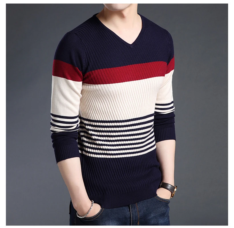 Свитера, толстый теплый пуловер для мужчин, повседневный полосатый свитер с v-образным вырезом, мужская одежда 2019, осенне-зимняя вязаная одежда для мужчин J768