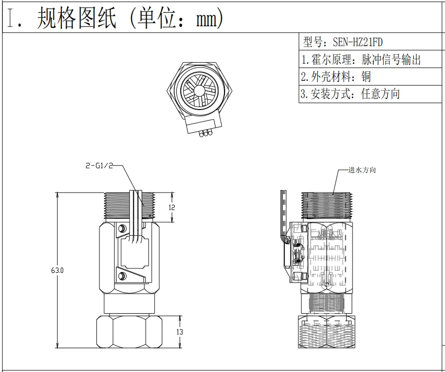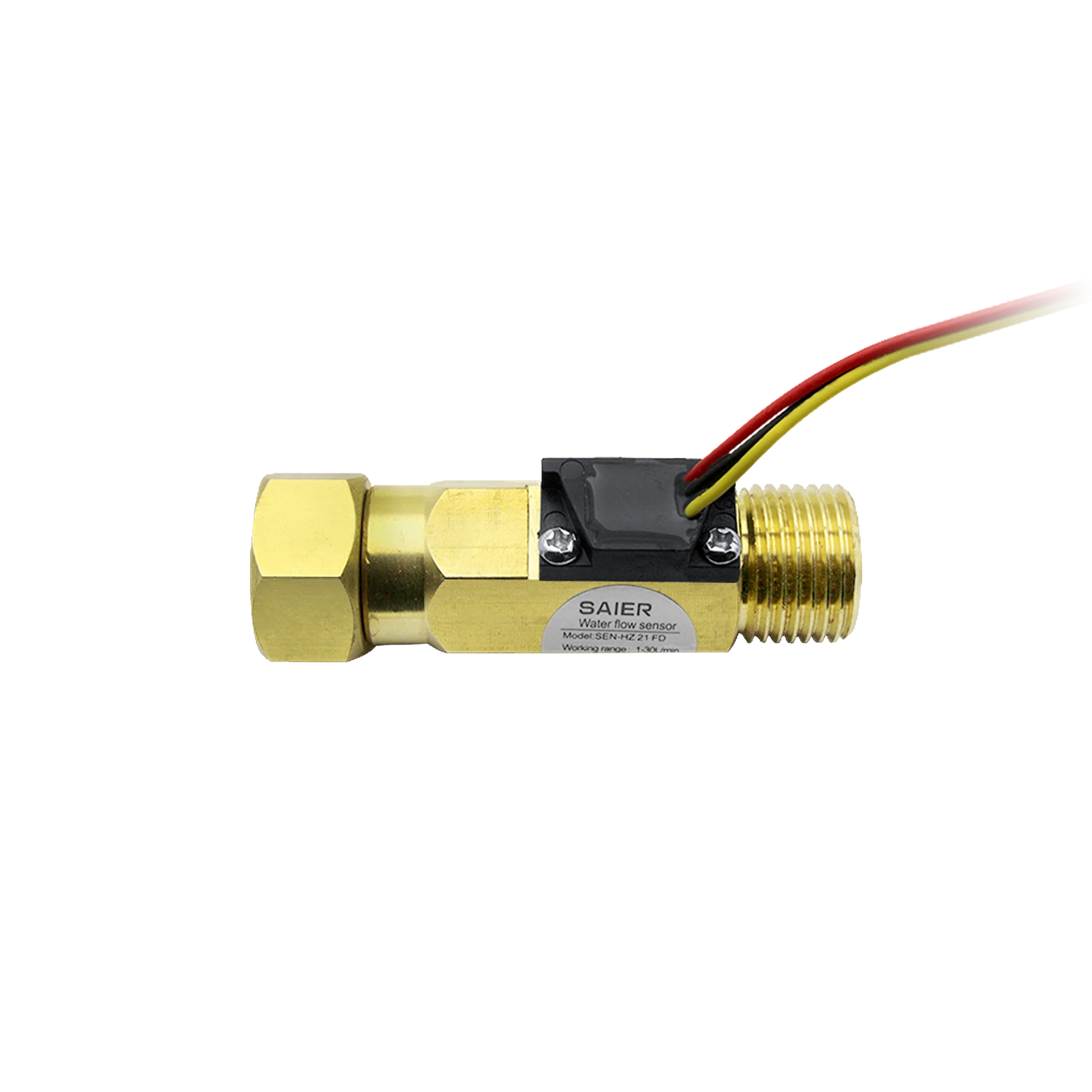 Датчик расхода воды SAIER изготовлен из высококачественного медного материала, состоит из латунного корпуса, водного ротора и датчика эффекта холла. Интегрированный Датчик эффекта Холла выводит соответствующий импульсный сигнал с каждым вращением и запечатывается из водопровода и позволяет сенсору оставаться в безопасности и сухости. Теория проста: Когда вода течет через ротор, ротор рулонов. Его скорость меняется с разной скоростью потока. Датчик эффекта Холла выводит электрический пульс с каждым вращением. Датчик очень прочный и долговечный в использовании, его Максимальное давление воды составляет 1,75 МПа. Легкий и имеет компактный размер, стабильную работу, низкое давление воды, очень легко установить и безопасно использовать. И он может быть идеально использован для водонагревателей, диспенсер для воды, очиститель воды, торговый автомат для воды, Кофеварка, Устройство измерения расхода, машина управления водой и так далее. Модель: SEN-HZ21FD Материал: цинковый сплав Цвет: золотистый Диаметр входа и выхода: DN15 Диапазон потока: 1 ~ 30 л/мин Средняя: Стандартная жидкость для питьевой воды Рабочее напряжение: DC4.5-18V Давление Производительность: 1.75MPA Спецификация линии и направление установки: по индивидуальному заказу Рабочая температура: 0-60 °C Изолированный резистор: >100 Ом Lead Way: Красный в соединении анода Желтая Выходная линия сигнала Черный GND Подключите катод Посылка включает в себя: 1 шт. латунный датчик расхода воды