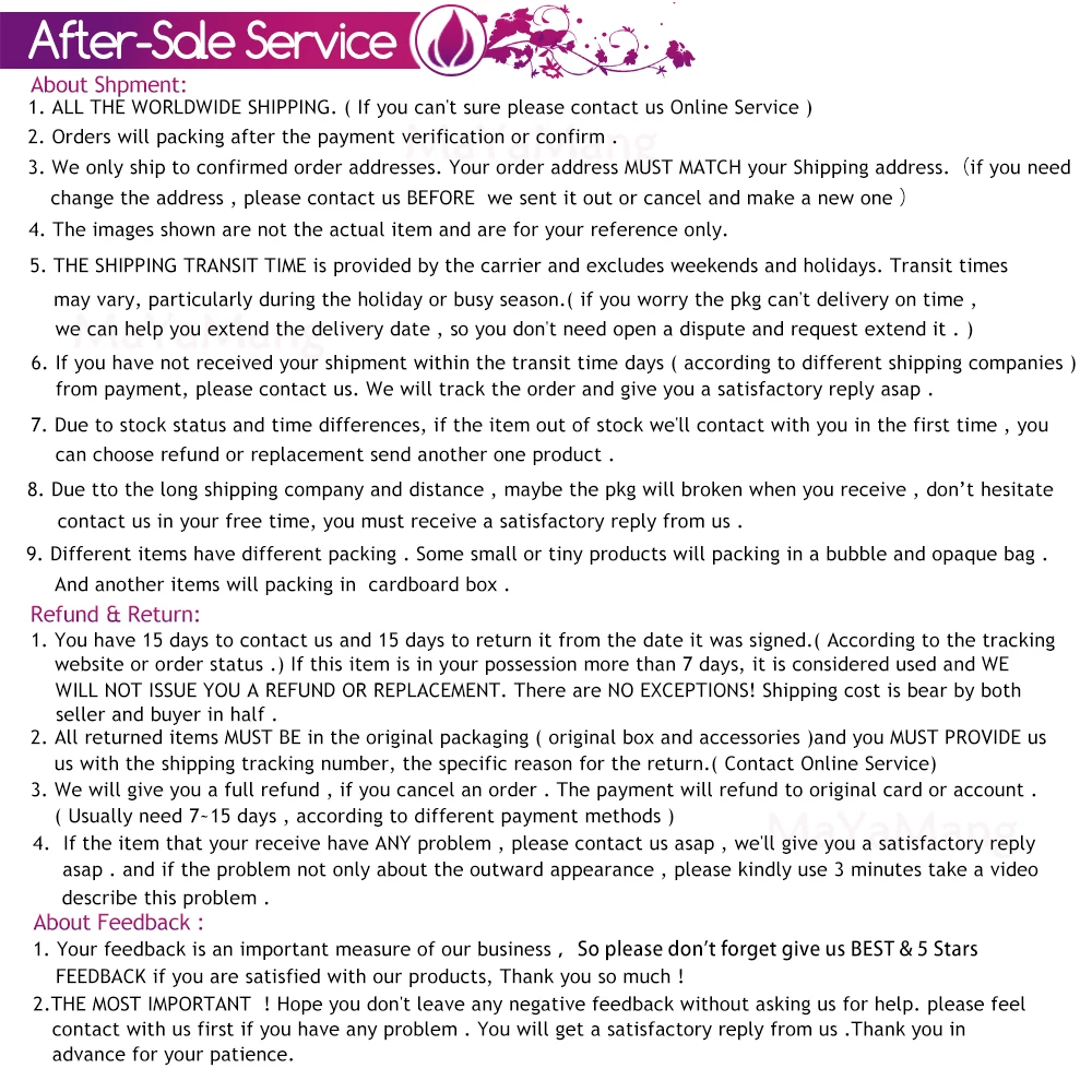2. Real color may slightly different from pictures due to computer screen's resolution, brightness, contrast etc. Hope understanding. Have a nice shopping day!