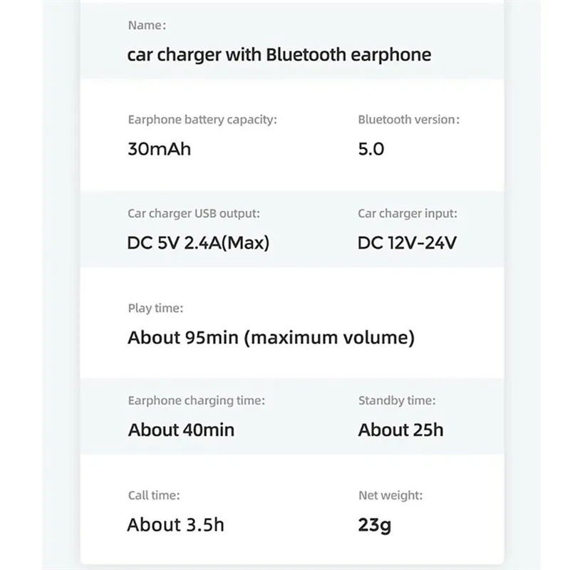 Характеристики: Материал: Поликарбонат Тип изделия: автомобильные наушники с Bluetooth напряжение: 12/24 В Выходное напряжение: 5 В выходной ток: 3,4 A Рабочая температура: 0-45 °C Выходной интерфейс: размер автомобильной сигареты: 74,5*37 мм расстояние приема Bluetooth: 10 м Время работы: воспроизведение музыки около 95 мин (Максимальная громкость), Время в режиме ожидания: 30 ч; Время разговора: 2 ч. Описание: 1. Абсолютно новый и высококачественный материал. 2. Автомобильное зарядное устройство Bluetooth гарнитура комбо. 3. Smart touch, Bluetooth 5,0, хранение и зарядка, HD вызов. 4. USB выход, долгий режим ожидания, дизайн в уши, компактный и легкий. 5. применимый диапазон зарядки: мобильный телефон, планшет, регистратор вождения и т. д. посылка включает в себя: 1 * наушники 1 * Автомобильное зарядное устройство 1 * Руководство по эксплуатации Примечания: 1. замеры сделаны вручную, поэтому возможны отклонения в 1-3 мм. 2. Из-за различных дисплеев и разного светильник, изображение может не отражать фактический цвет изделия. Спасибо за понимание.