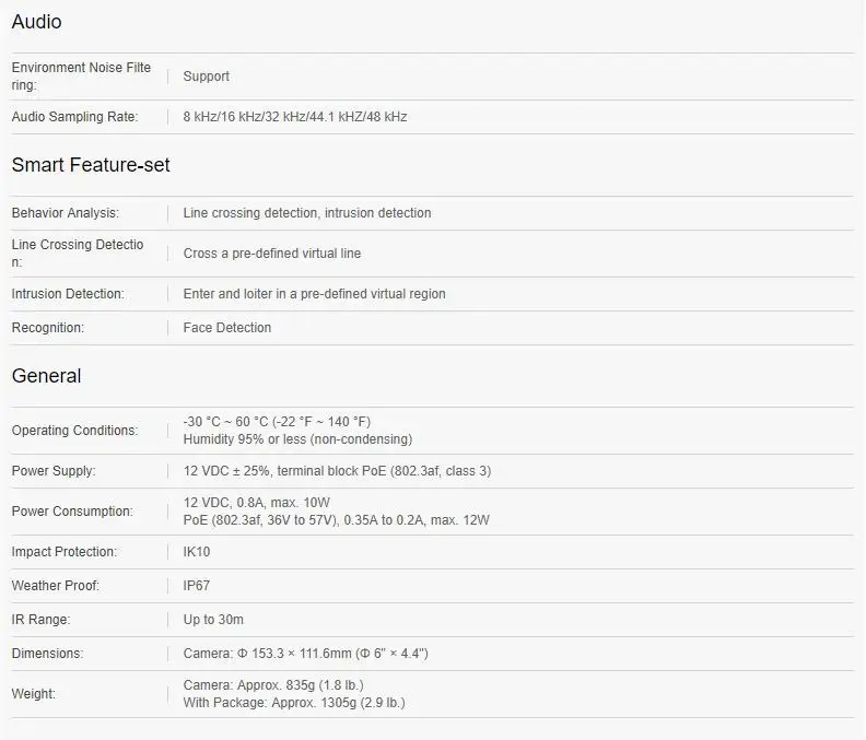 • Цвет: 0,01 лк @ (F1.2, AGC ON), 0,018 лк @ (F1.6, AGC ON), 0 Люкс с ИК