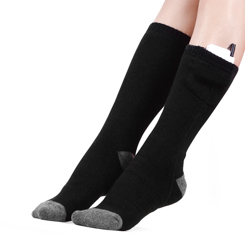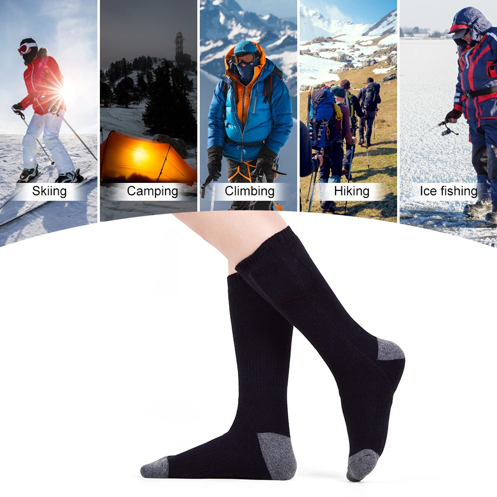 A carbon fiber heating sheet at the bottom of foot heats your socks when you turn on the power, 35-55°C controllable temperature, can keep your feet warm during ice fishing, hiking, skiing and working outdoors in winter for about 4-5 hours after 3 hours full charged.