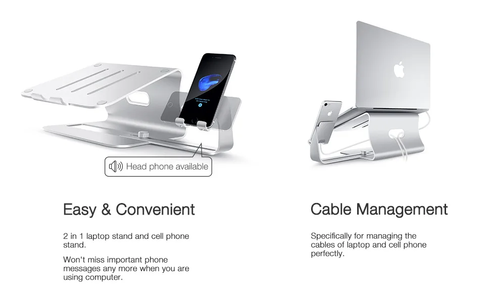 Особенности -2 в 1 Подставка для ноутбука и смартфона, идеальное сочетание подставки для ноутбука и подставки для смартфонов. -Элегантная Серебристая подставка идеально подходит для большинства ноутбуков и смартфонов -Основание подставки изготовлено из противоскользящего силикона, который удерживает стойку TI-Station. -Удобный вырез и вставка кабеля, предотвращает чрезмерный изгиб кабеля, делает все организованным. -Повышает высоту экрана до уровня глаз для лучшей эргономики. Вы можете наслаждаться повышенным углом обзора, не занимая много места на вашем столе 1. Этот мобильный компьютер 2-в-1 подставка вмещает ноутбуки всех размеров, как, например, Macbook Air, Macbook Pro, и iPhone серии мобильных телефонов. 2. Изготовлен из высококачественного алюминия, подставка для ноутбука имеет специальный дизайн, который помогает компьютеру остыть и спроектировать Нескользящие силиконовые подушечки вокруг подставки, чтобы предотвратить скольжение и максимально защитить компьютер от царапин. 3. Высота подставки экрана ноутбука до уровня глаз, снимает давление на талию, плечо и шею. 4. Кольцо управления кабелем аккуратно собирает все ваши кабели для грязного рабочего стола. 5. Красивый, простой и занимает только небольшую часть рабочего пространства, но и для ваших аксессуаров, чтобы обеспечить много места. Посылка включает в себя 1 шт. подставка для ноутбука 1 шт. подставка для телефона