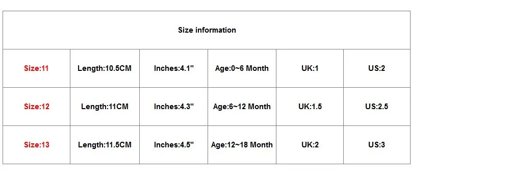 Информация о размере Размер: 11 Длина: 10,5 см Дюйм (ов): 4,1" Возраст: 0 ~ 6 Месяц Великобритания: 1 США: 2 Размер:12 Длина: 11 см Дюйм (ов): 4,3" Возраст: 6 ~ 12 Месяц Великобритания: 1,5 США: 2,5 Размер:13 Длина: 11,5 см Дюйм (ов): 4,5" Возраст: 12-18 месяцев Великобритания: 2 США: 3