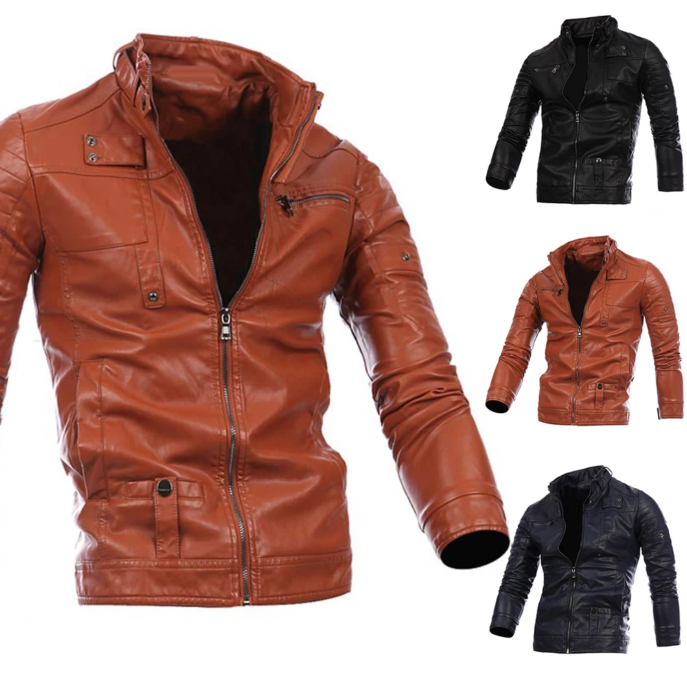 Мода для мужчин осень зима искусственная кожа Стенд воротник молния Карманы Тонкий пиджак