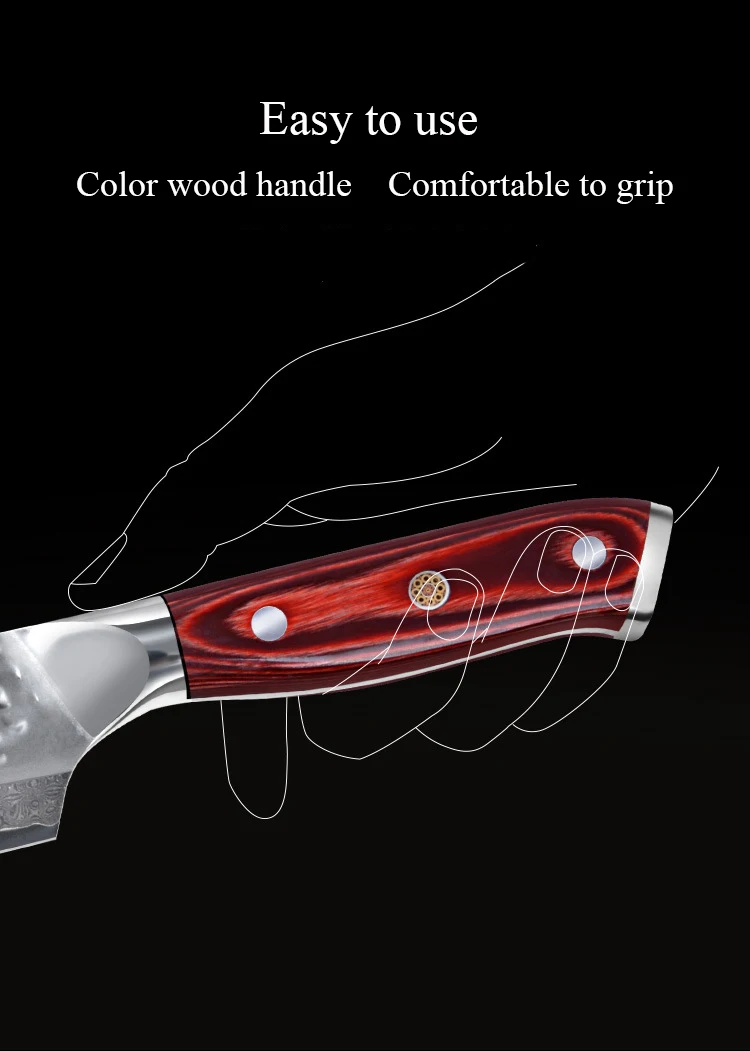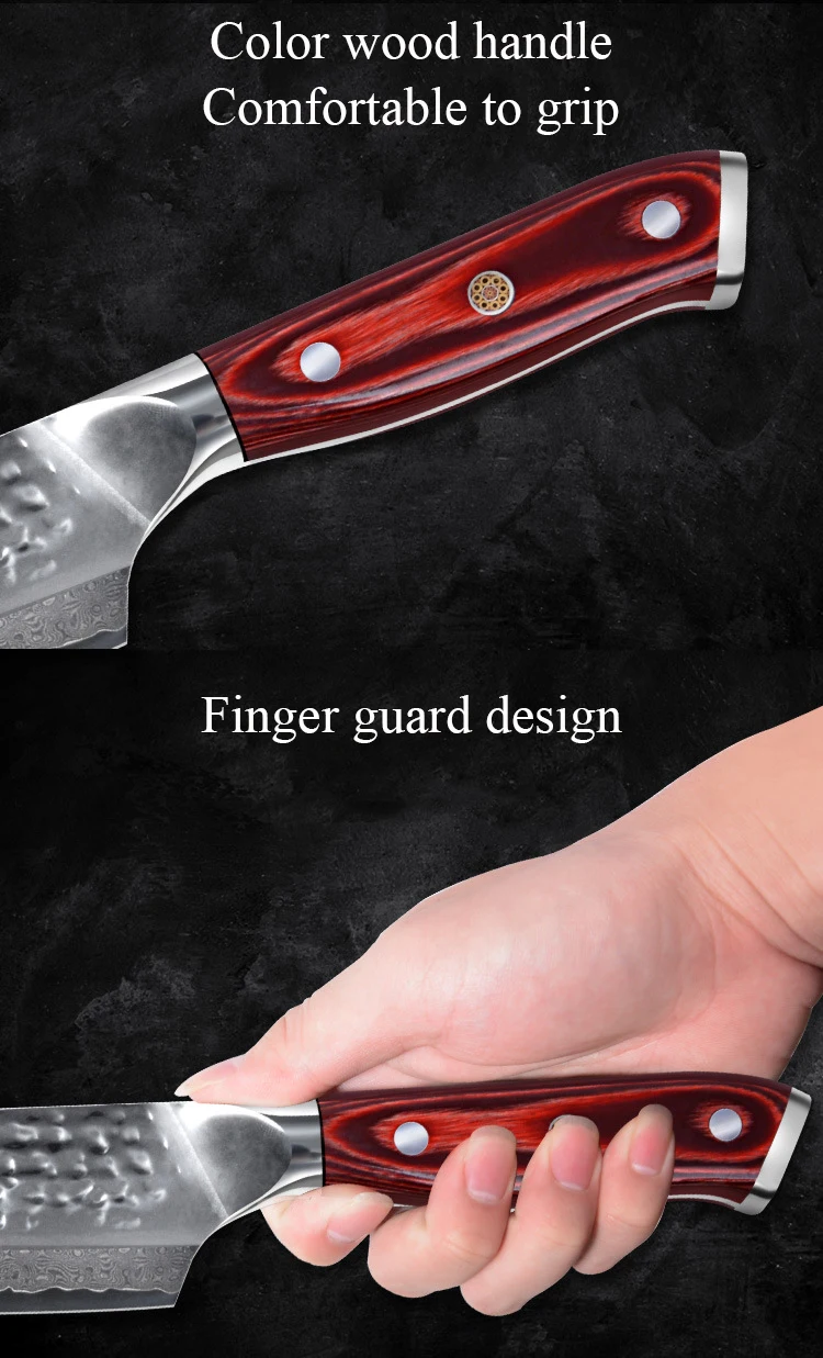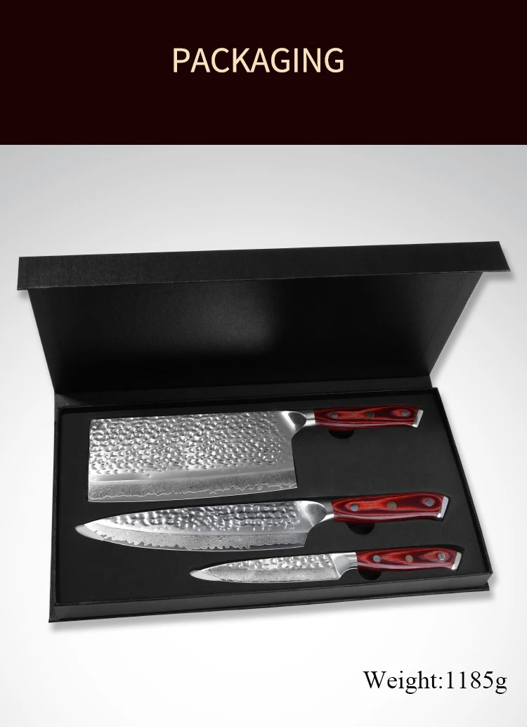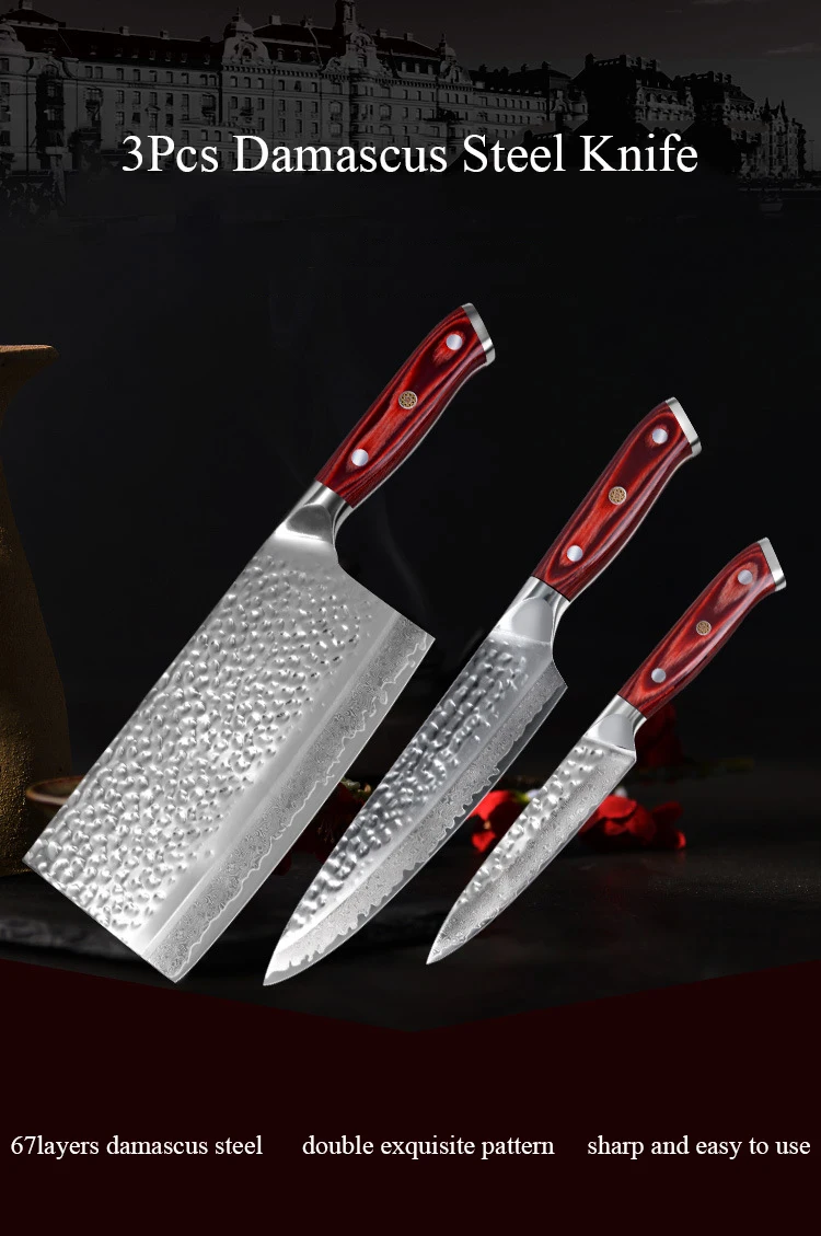 Особенности: Лезвие этого ножа высшего класса прочное и острое благодаря большему количеству процедур. Он высококлассный и прочный. Технические характеристики: Размер: как показано на картинке 1. Материал: (Дамасская сталь) лезвие. Redwood ручка 1. Твердость: 58-62 HRC Упаковка 3 шт/красота черная коробка Примечание: 1. Из-за различных настроек монитора и светильник эффект, фактический цвет элемента может быть s светильник ly отличается от цвета, представленного на снимках. Спасибо! 2. Возможны незначительные отклонения в измерениях из-за ручного измерения.