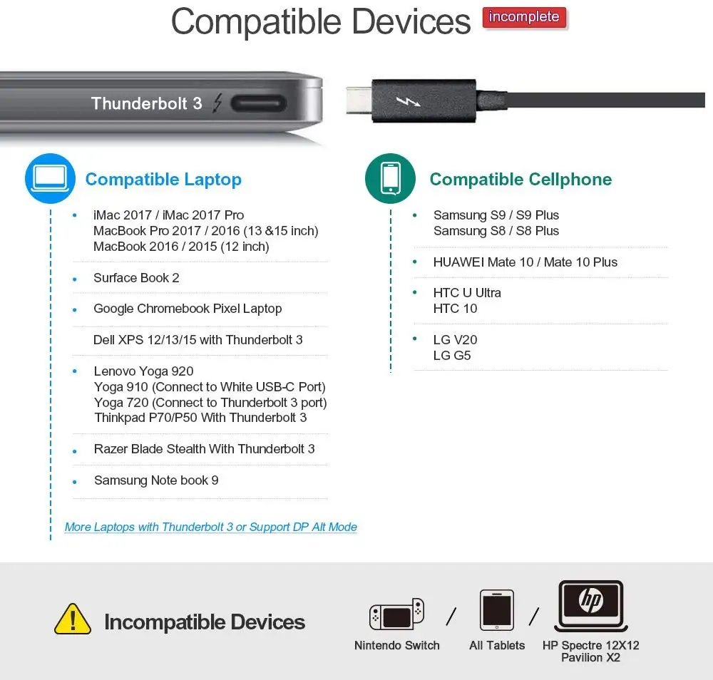 Этот адаптер построен с решением [Альтернативный режим DisplayPort] * MacBook Pro 2017 и 2016 * MacBook 12 "2016 и 2015 * Новый Chromebook Pixel * Dell XPS 15 и 13 и 12 * Yoga 910, для пользователей Yoga 910, Пожалуйста, подключите адаптер только в белый USB-C женский порт. * Йога 900 (Йога 4 Pro) * HP Spectre x360 13 и 15 дюймов * Asus Zen AIO все в одном ПК * Samsung Galaxy S8/S8 + * HUAWEI Mate 10 * ThinkPad P50 и P70