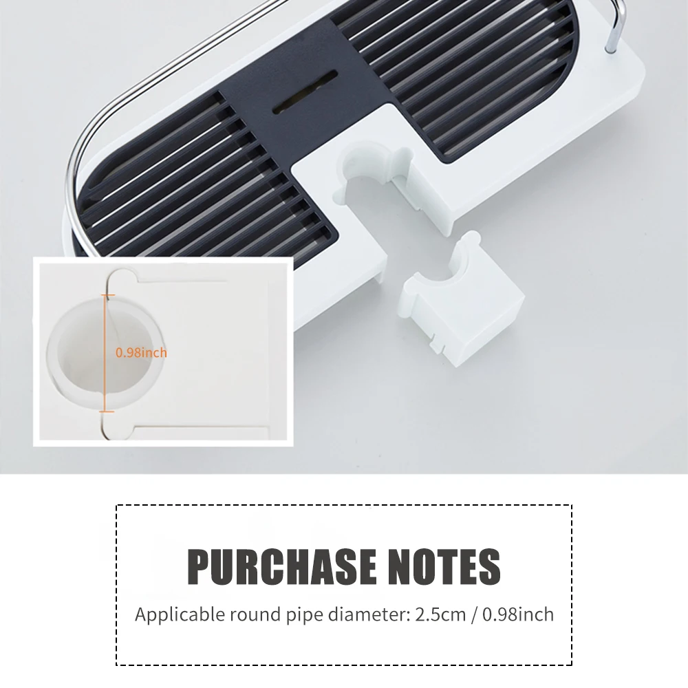 Полка для душа изготовлена из высококачественной нержавеющей стали и АБС-материалов, устойчива к ржавчине и прочна, устойчива к царапинам и устойчива к деформациям. Полый дизайн для быстрого высыхания и минимального роста бактерий. Идеально подходит для хранения туалетные принадлежности для ванной комнаты. Подходит для круглых труб и труб диаметром 2,5 см/0,98 дюйма.