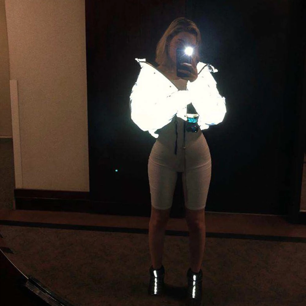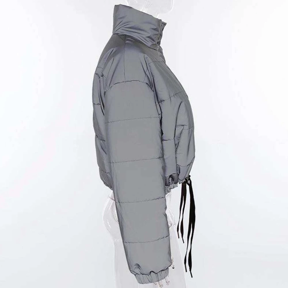 Женская укороченная куртка оверсайз, ночная Светоотражающая однотонная серая зимняя куртка на молнии с пуговицами, женская теплая Свободная куртка с длинным рукавом, Chaqueta Mujer