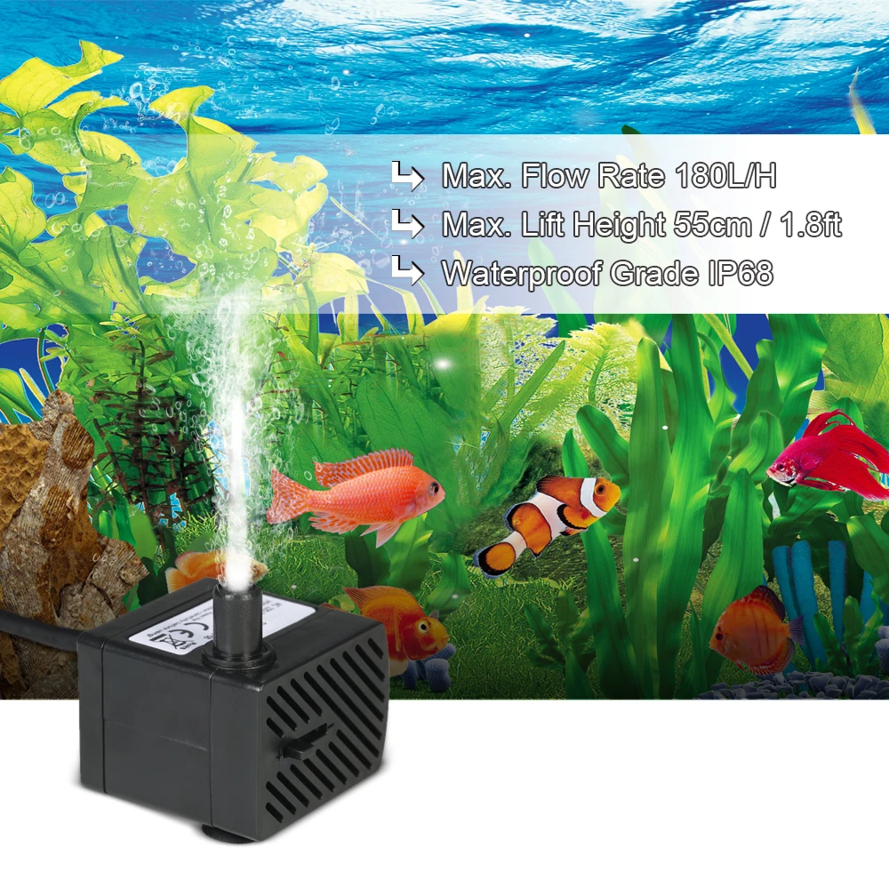 Насос является многоцелевым насосом, который может быть полностью погружен. Компактный, многофункциональный и съемный, идеально подходит для аквариумов малого и среднего размера, настольных фонтанов, водных садов и гидропонных систем и т. д. Добавьте больше циркуляции в свой аквариум и Дайте вашей милой рыбе почти естественную среду.