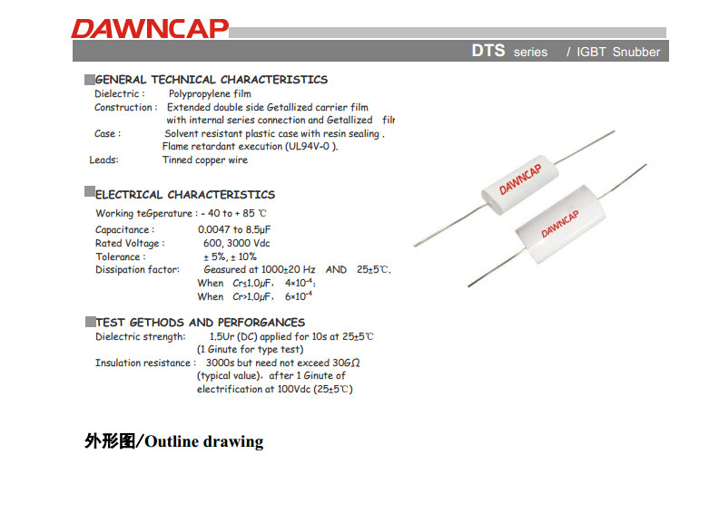 Dawncap DTS безиндуктивный Высокая частота высокого направления поглощения безиндуктивный конденсатор с алюминиевой крышкой Массовое производство и продажа, оригинальное производство! 0,47 мкФ 4000VDC 45*50 мм двойной 1,2 мм медный провод 3 мкФ 1200VDC 26*60 мм и 36*60 мм два ~ Более Технические характеристики:
