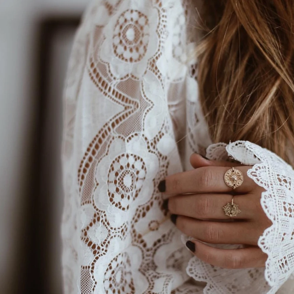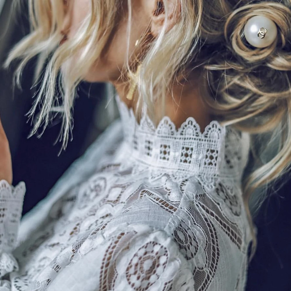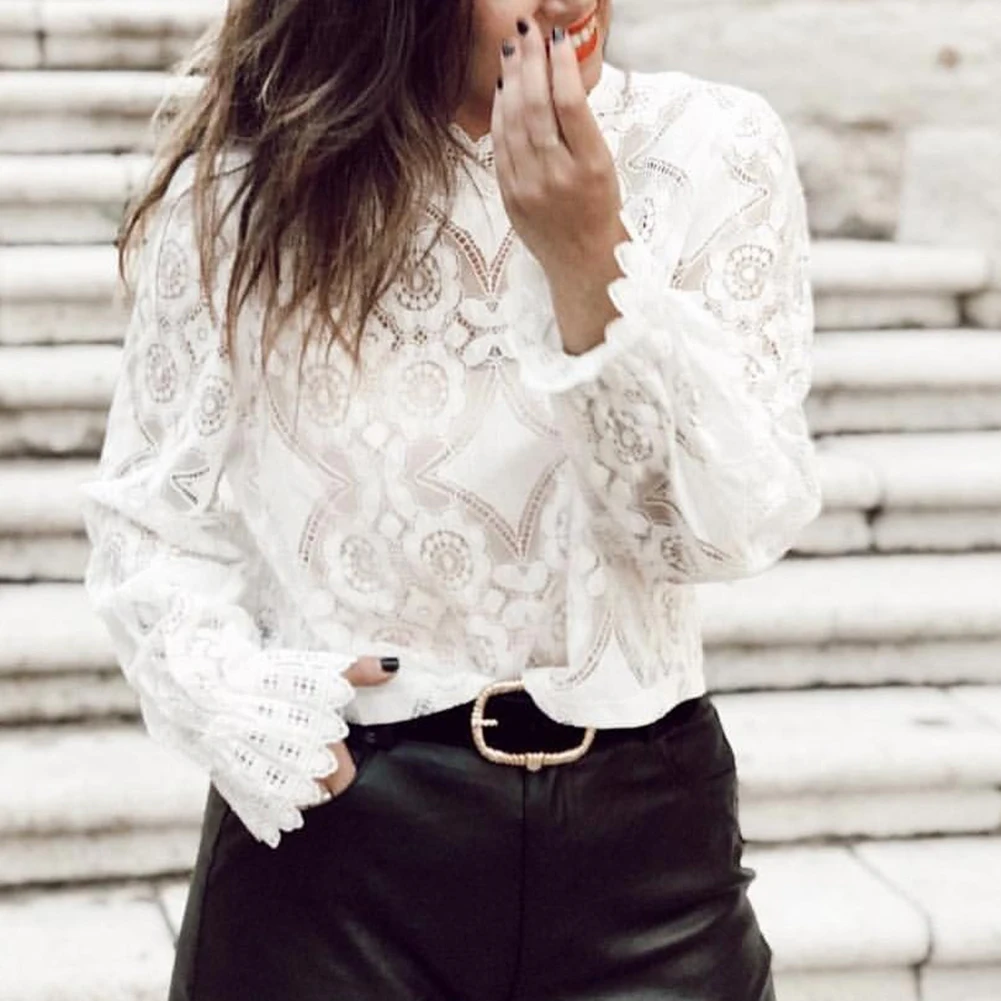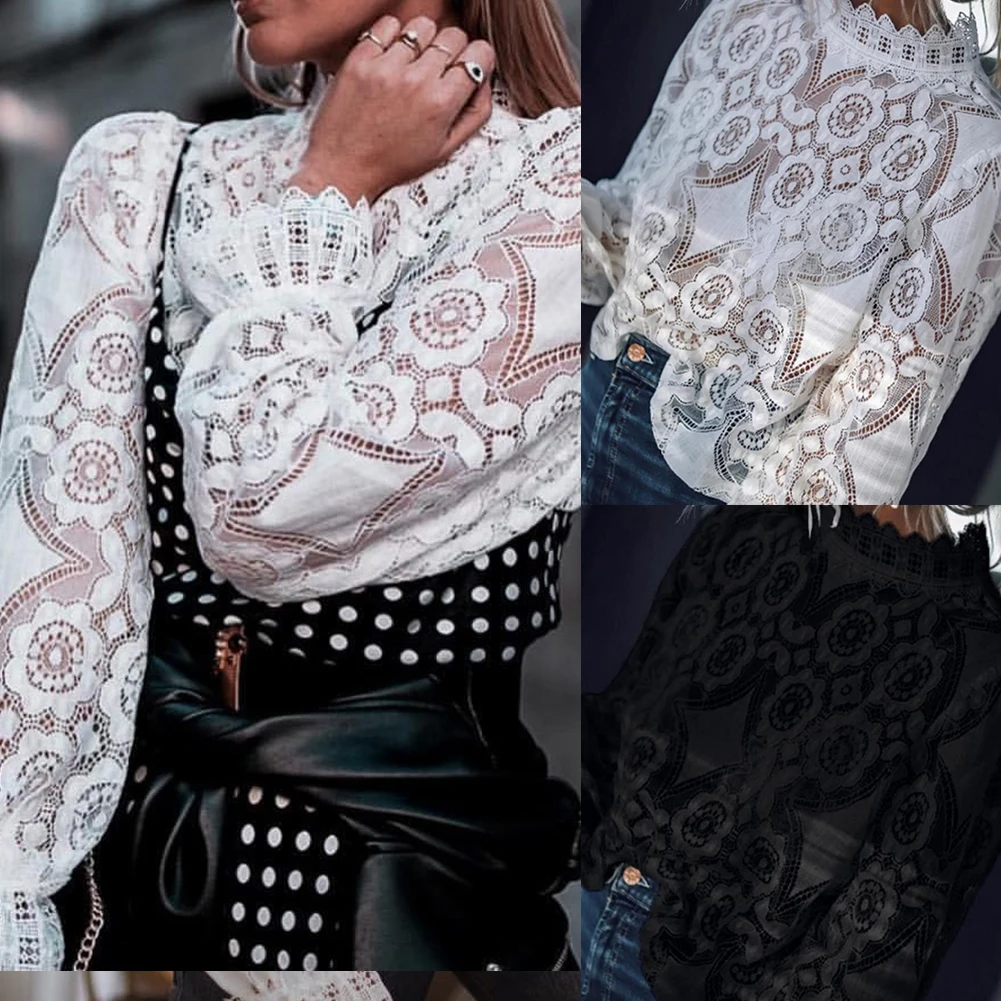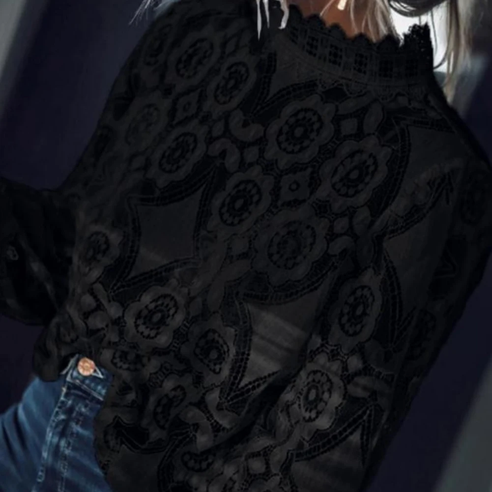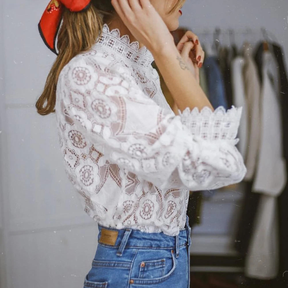 Сексуальная Женская Осенняя Кружевная блуза с длинным рукавом и стоячим воротником