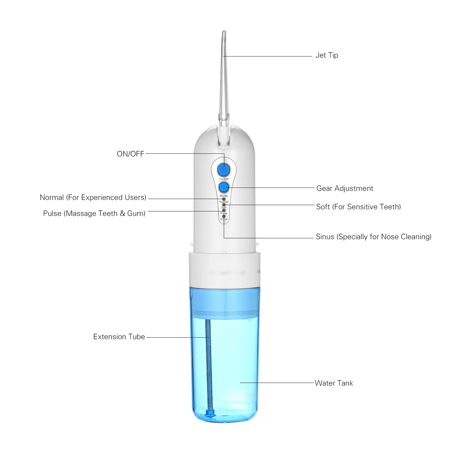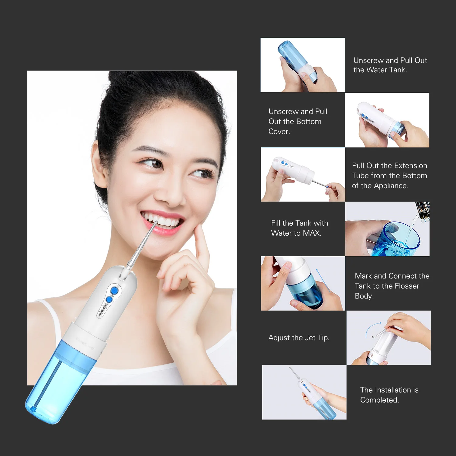 С 3 типами струйных наконечников и 4 режимами использования, эта портативная беспроводная зубная водяная нить проста в использовании и помогает удалять пятна, мусор, вредные бактерии между зубами и гумлином, делает ваши зубы чистыми и здоровыми. Хороший продукт, который вы не пропустите!