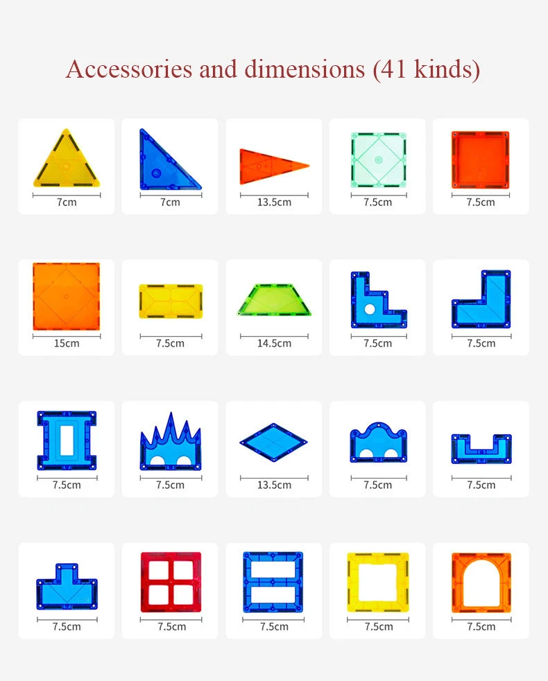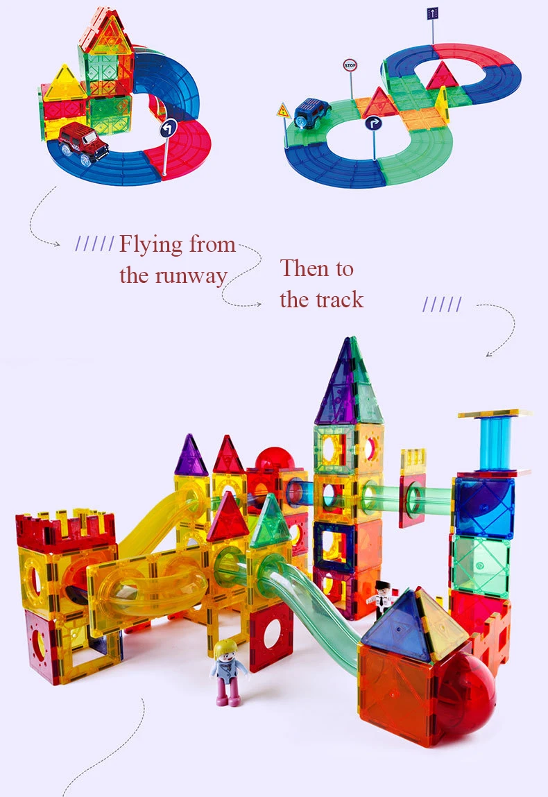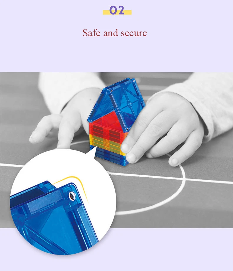 Из-за магнитного эффекта для ce, он может держать любые две части плотно. Поэтому его можно использовать для изготовления различных конструкций. В соответствии с возрастом детей, мы можем комбинировать различные строительные блоки (здание дома, транспорт, людей, животных, большой парк развлечений и т. д.).