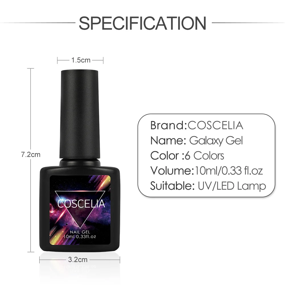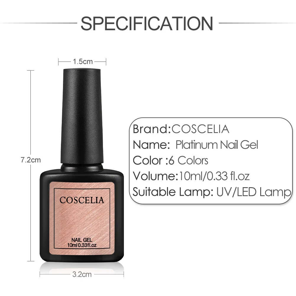 Бренд: COSCELIA Объем: 10 мл/0,33 унций Цвет: как на картинке Подходящая лампа: УФ-лампа/Светодиодная лампа Сертификация: MSDS, SGS