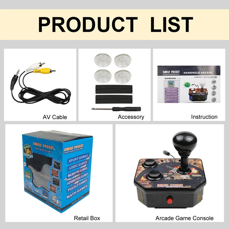Продукт NPC1000-это совершенно новый стиль портативной аркадной игровой консоли 12 бит, и он имеет лучшую стабильность, высокоточные рокеры 360 °, задержка почти равна нулю. Он встроен в 180 игр (включая спорт, приключения и головоломки, а также мышление и обучающие игры, включая память, математику и логику). Который любят многие потребители по всему миру, если вы хотите играть в классические игры с хорошими друзьями или семьей, помните счастливое детство, забудьте о проблемах жизни и работы, пожалуйста, не пропустите это, обязательно выберите его! Эта игровая консоль может удовлетворить ваши требования! Помните, что этот товар-отличный выбор для хорошего друга!