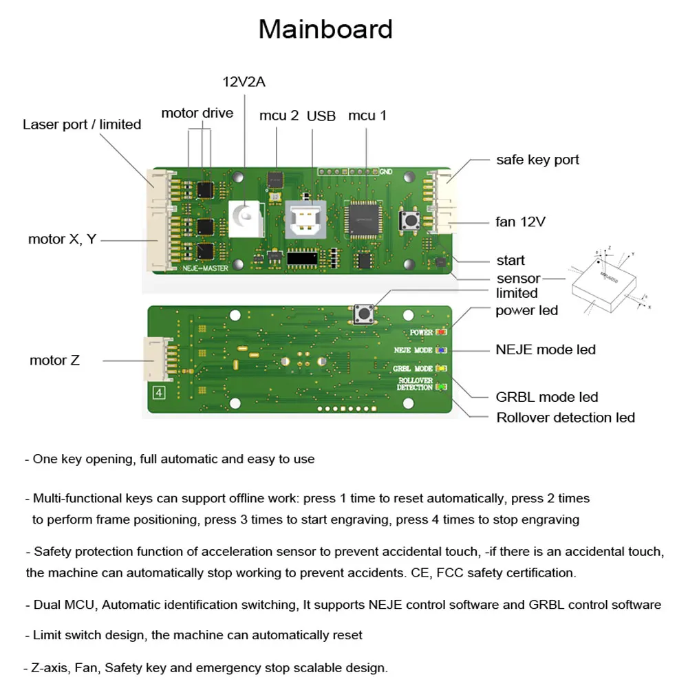Функция: встроенная защита датчика. Dow MCU: один MCU для контроллера Suport NEJE (Windows и MAC), а другой для контроллера GRBL.
